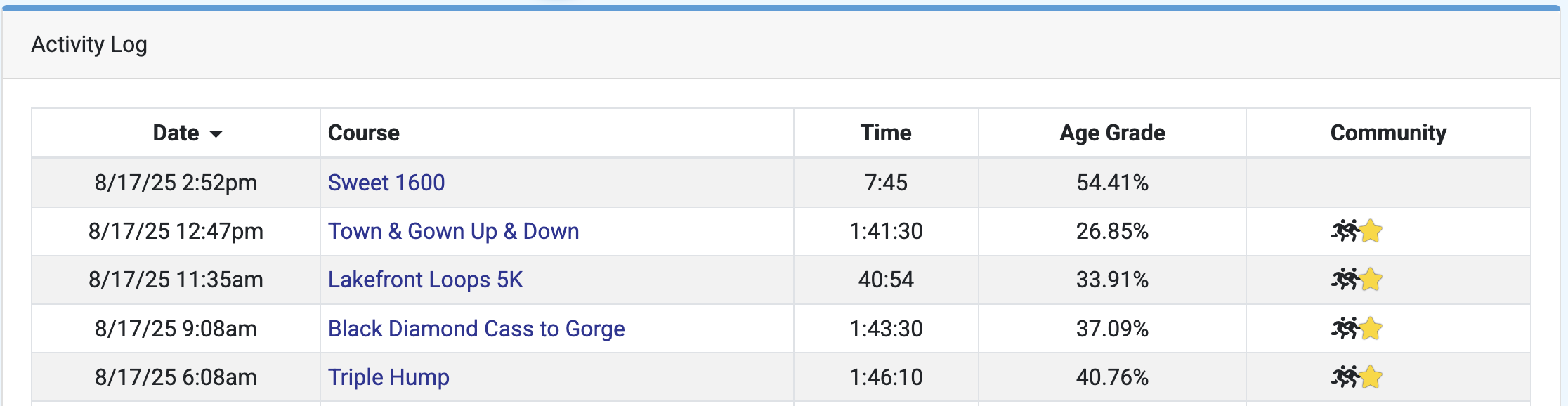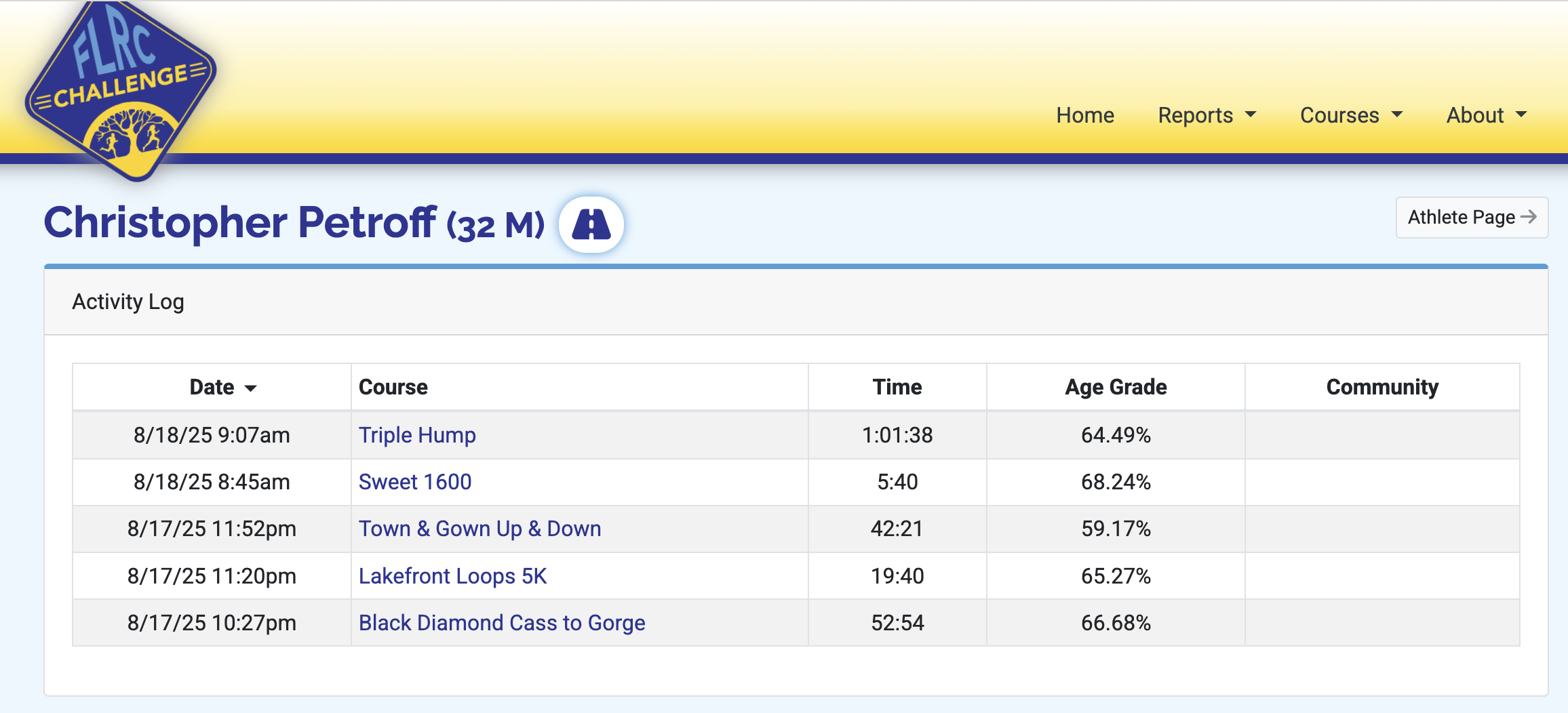 This may also be the first time anyone has split a Challenge to go home and sleep during the middle. You have 12 hours to complete the 5 courses, so Chris led off with the Black Diamond Cass to Gorge, Lakefront Loops, and Town & Gown Up & Down courses that are all quite close last night, and then finished up with a Sweet 1600 and Triple Hump this morning. As a result, he ended up with by far the fastest running time (3:02:13) but the longest total time (11:41:38), finishing with only 19 minutes to spare.