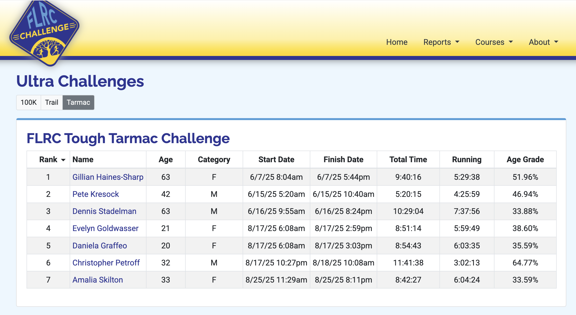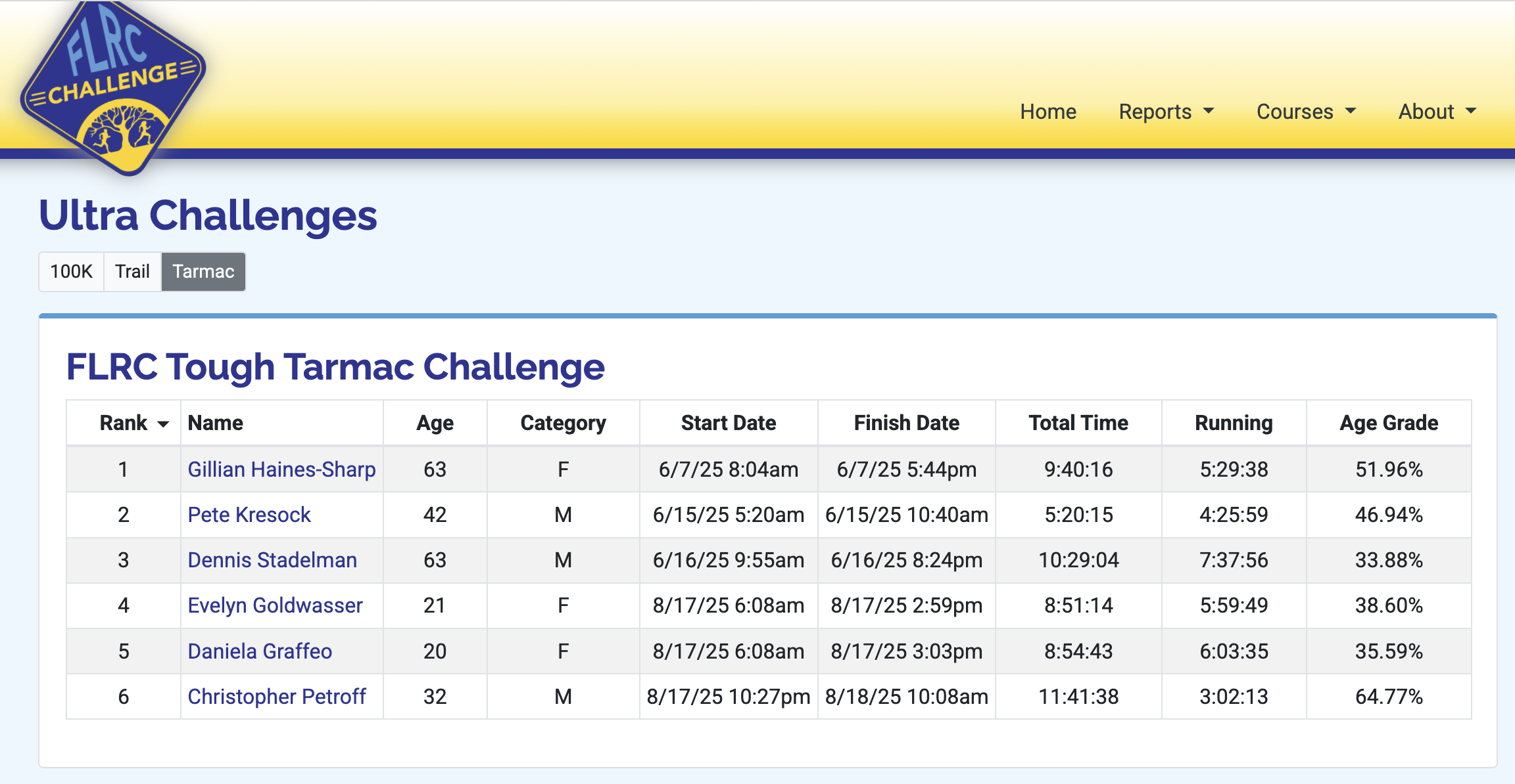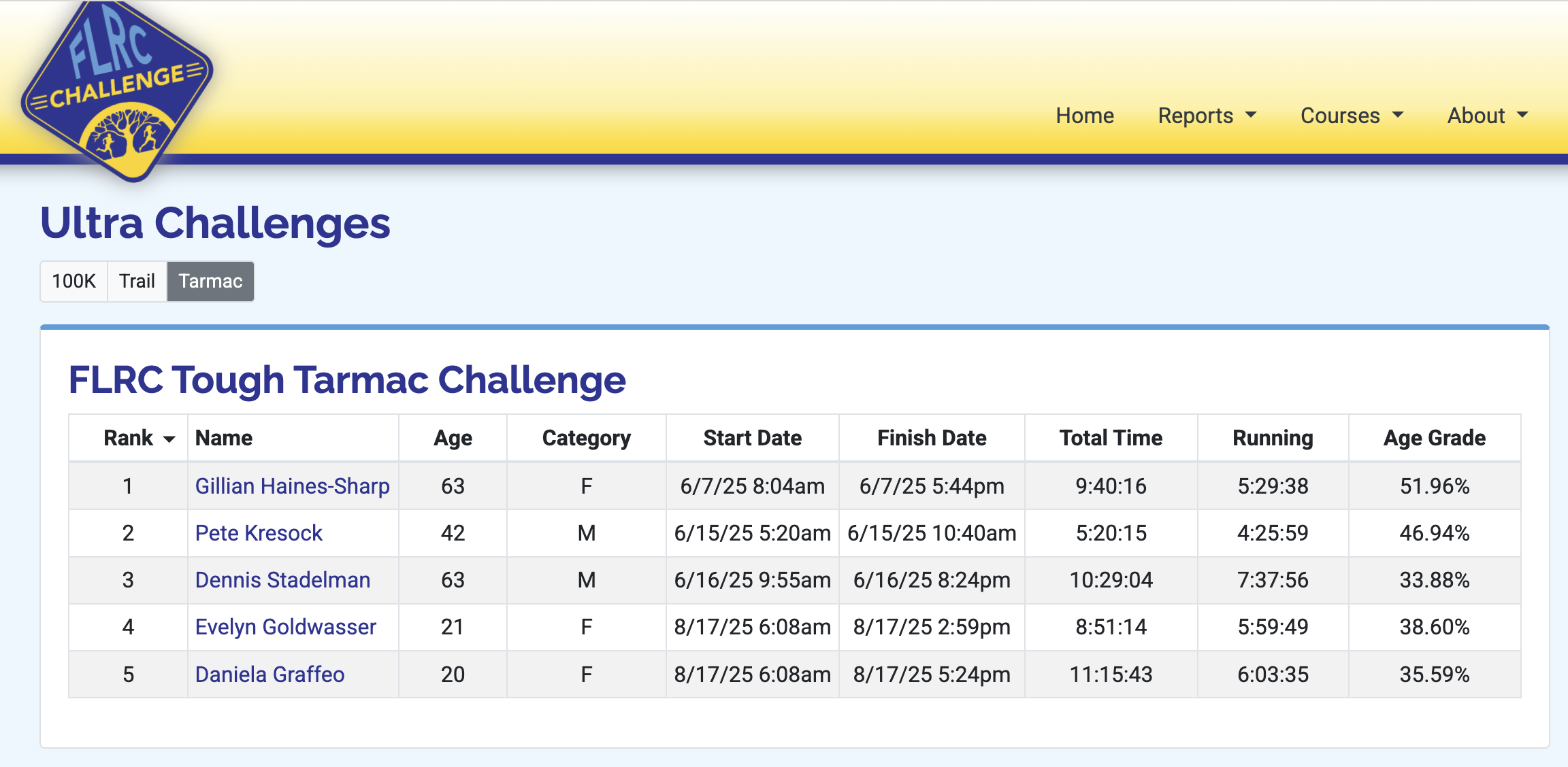 @Challengers Kudos to two runners new to the Challenge, Evelyn Goldwasser and Daniela Graffeo, for jumping from four courses done to nine in one day by running the five road courses to complete the FLRC Tough Tarmac Challenge today!