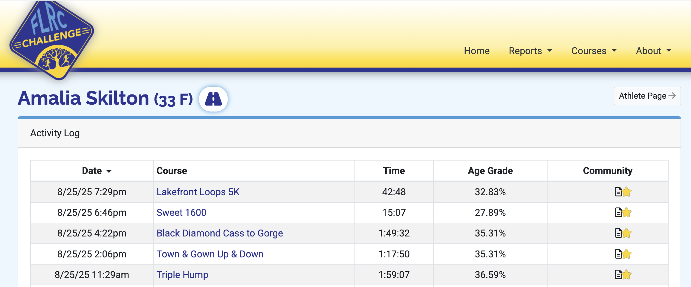 @Challengers With just seven days left in the Challenge, we have our seventh Tough Tarmac Challenge completion of the year. Congrats to Amalia Skilton for completing all five road courses yesterday, first getting Triple Hump out of the way, then coming into Ithaca for Town & Gown Up & Down, Black Diamond Cass to Gorge, a Sweet 1600 on the Cornell track, and a final Lakefront Loops 5K.