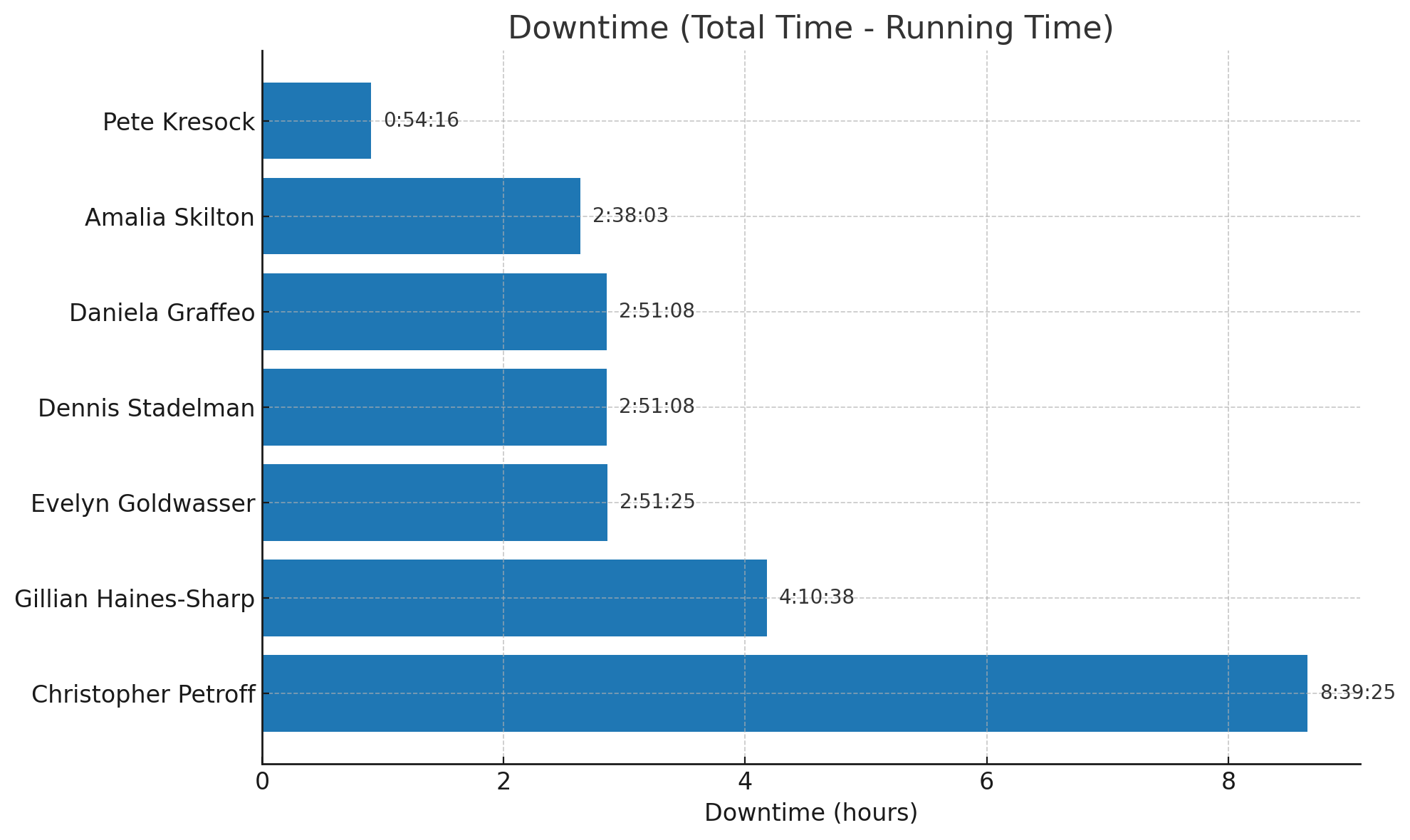 I was curious how the amount of downtime varied between efforts, and ChatGPT was happy to evaluate the screenshot and produce this chart. (I did only sanity checks on the math, so I hope it got it right.) It’s amusing that our two fastest finishers, Chris Petroff and Pete Kresock, are on opposite ends of the chart, but that’s because Chris used some of his downtime to sleep and biked between the courses, whereas Pete did them as quickly as possible.