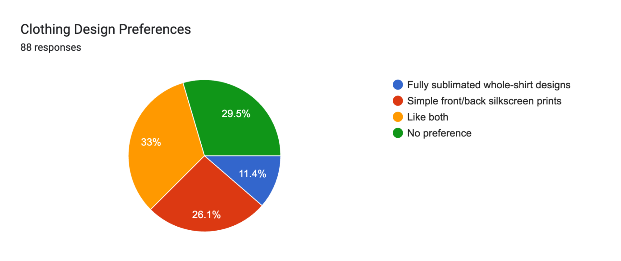 Similarly, the responses regarding Clothing Design Preferences are entirely mixed. The simple front/back silkscreen prints (such as the FLRC Rebus shirts, the Turkey Trot sweatshirt, and the Ithaca 5&10 shirts) garnered 26% of the votes, where the fully sublimated designs (Challenge shirts, Skunk Cabbage shirts) garnered 11%, but 33% of people like both, and 30% have no preference. For the 2027 Skunk Cabbage, I’ll probably do a simple design on cotton.