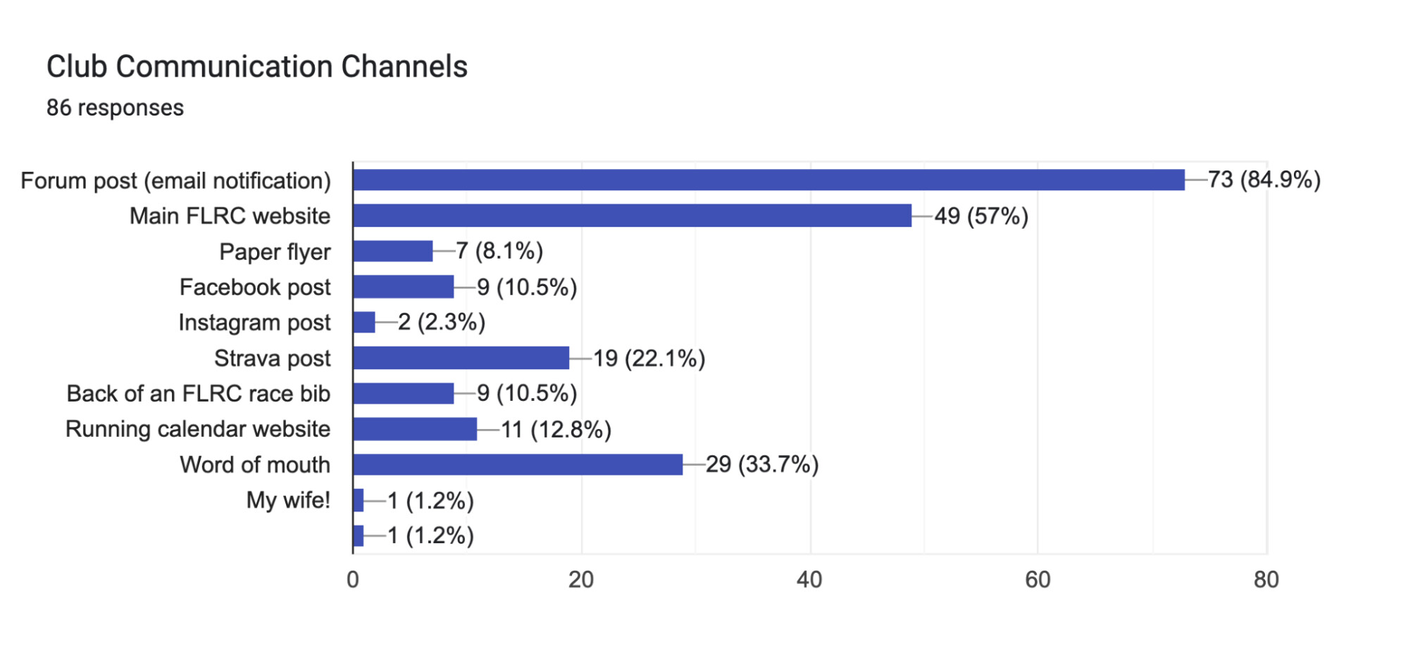 Most people learn about FLRC events through the FLRC Forum and the club website, with word of mouth as the third most common method. After that, Strava posts, running calendar sites, the back of FLRC race bibs, Facebook, paper flyers, and Instagram (in that order) all played smaller roles. They’re still valuable, though, especially when it comes to reaching people who don’t already know about the forum or club website.