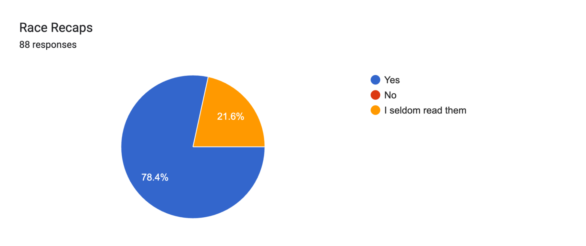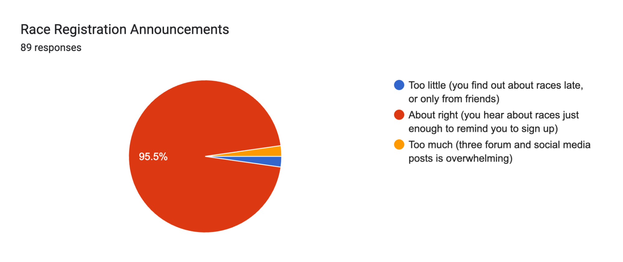 Nearly everyone felt the number of race announcements was just right, with two people saying it was too many and two saying it was too few, so we’ll stick with our current approach.