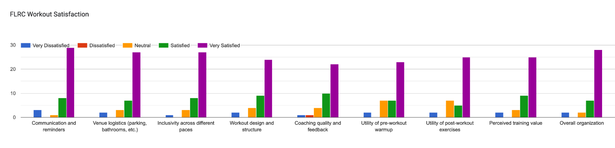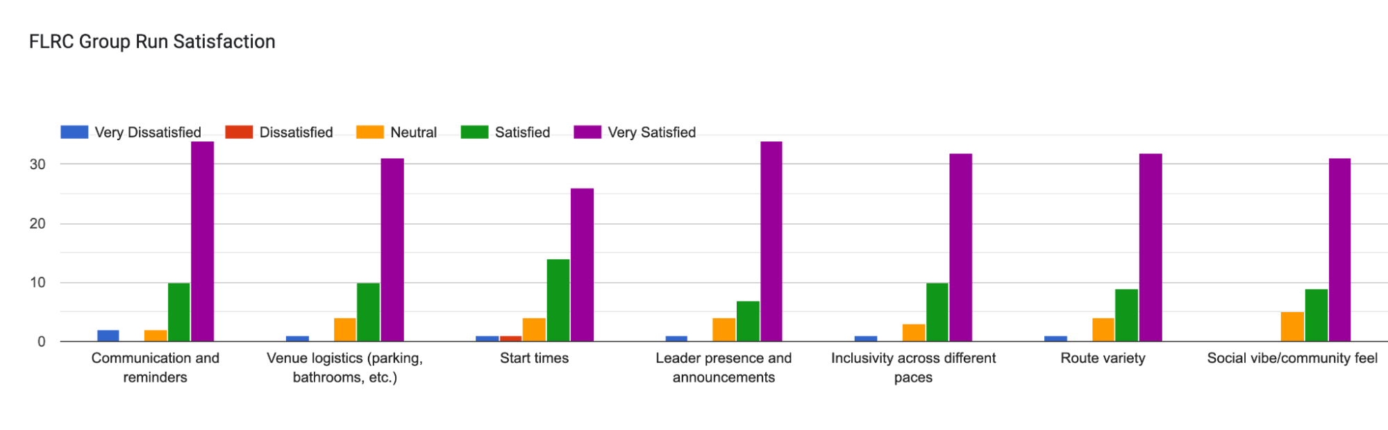 The final group of satisfaction questions revolved around group runs. 92% of the responses were in that Satisfied or (as usual, much more common) Very Satisfied category.