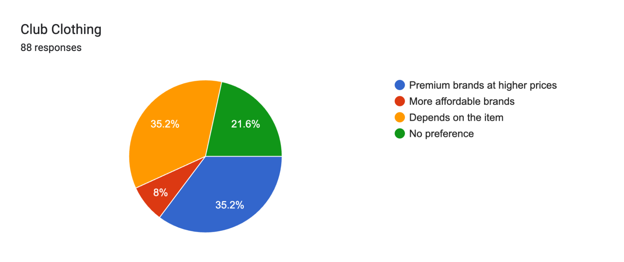 Regarding brands, responses were mixed. About 35% of respondents prefer the premium brands, even if that means higher prices (such as with the Trail Circuit shirts), while 8% prefer the more affordable bulk brands (such as with the new FLRC Rebus T-shirts); another 35% think it depends on the item, and 22% have no preference. To my mind, that says that we should keep mixing it up.