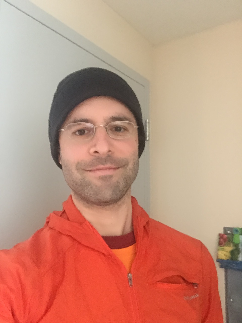 I’m calling a double on this one, wearing my Cornell Cross Country sweatshirt from 1986 and with the fabulous Egg Cairn by Andy Goldsworthy (from the Sapsucker Woods trails) in the background. The trails are good on snowshoes; they’d be pretty tough to run otherwise.
