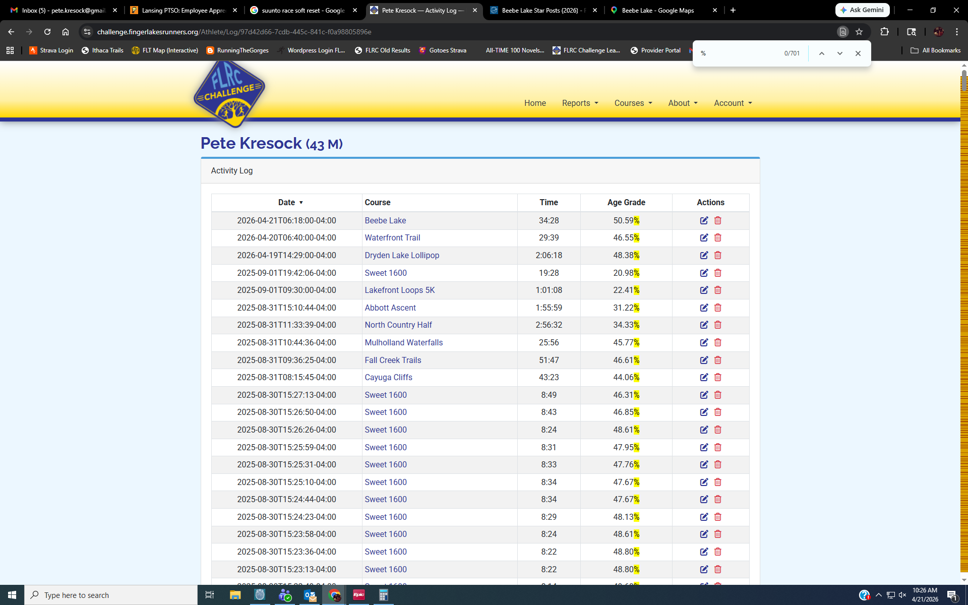 Fun side note: I was messing around on the Leaderboard and discovered a quick and easy way to see how many lifetime Challenge runs someone has logged. Go to your personal athlete homepage and click the “Activity Log” button. This lists every run you’ve done in the Challenge’s six-year history. Use the search function in your browser to search the % character and voila! The result total equals the total number of lifetime runs you’ve recorded. This works in Chrome on my desktop and Safari in iOS. I’d assume it also works in Chrome for Android.