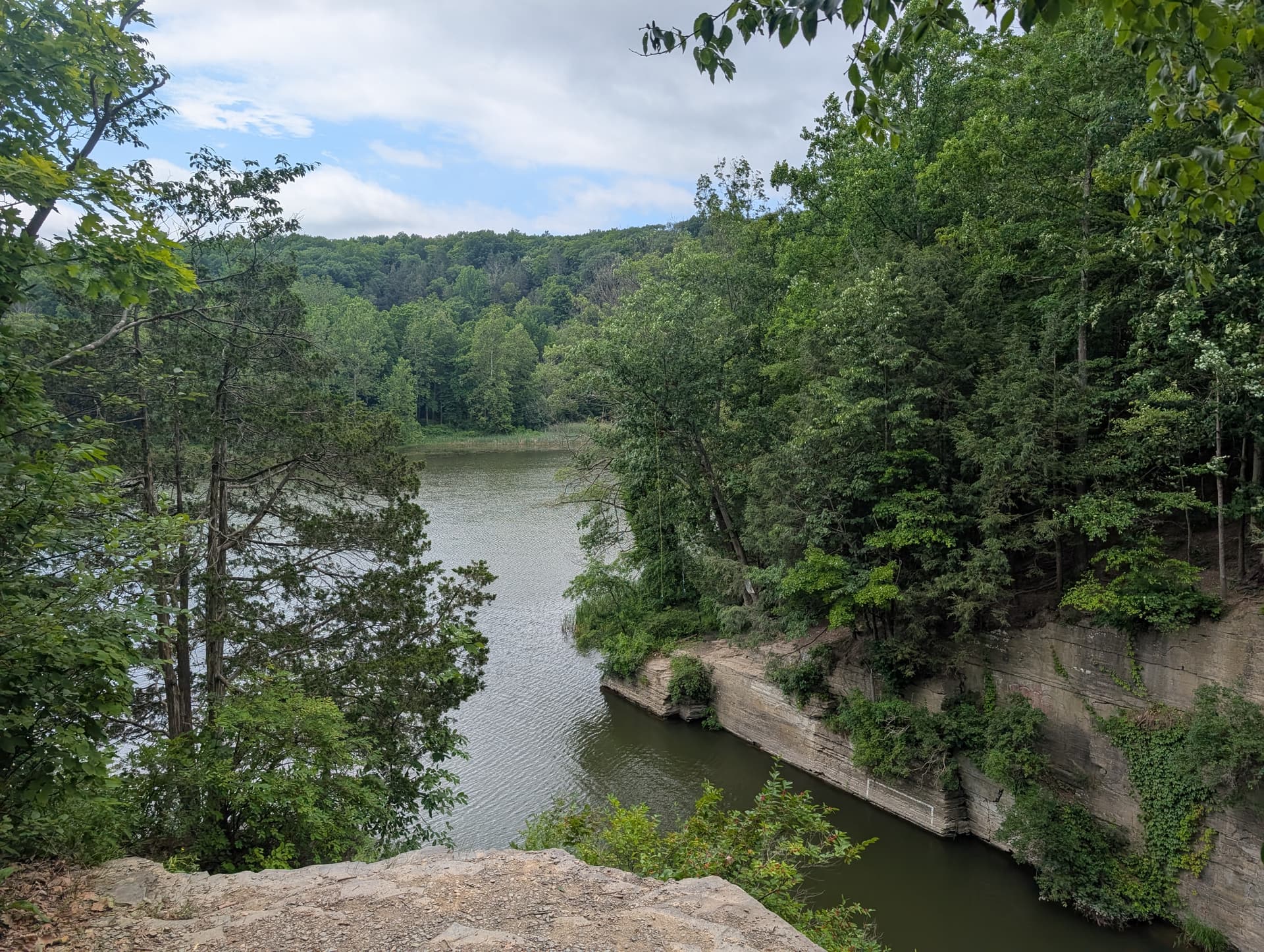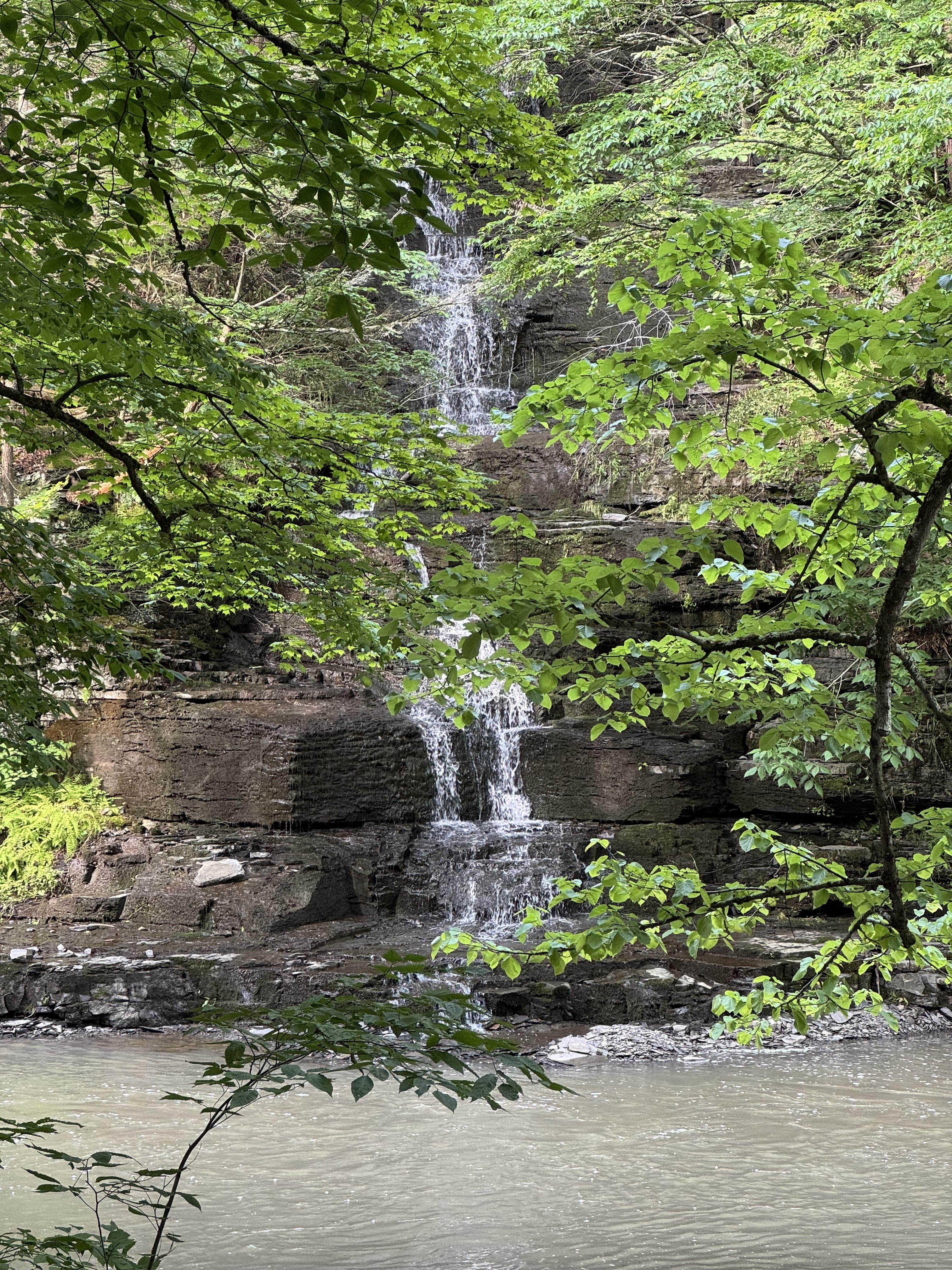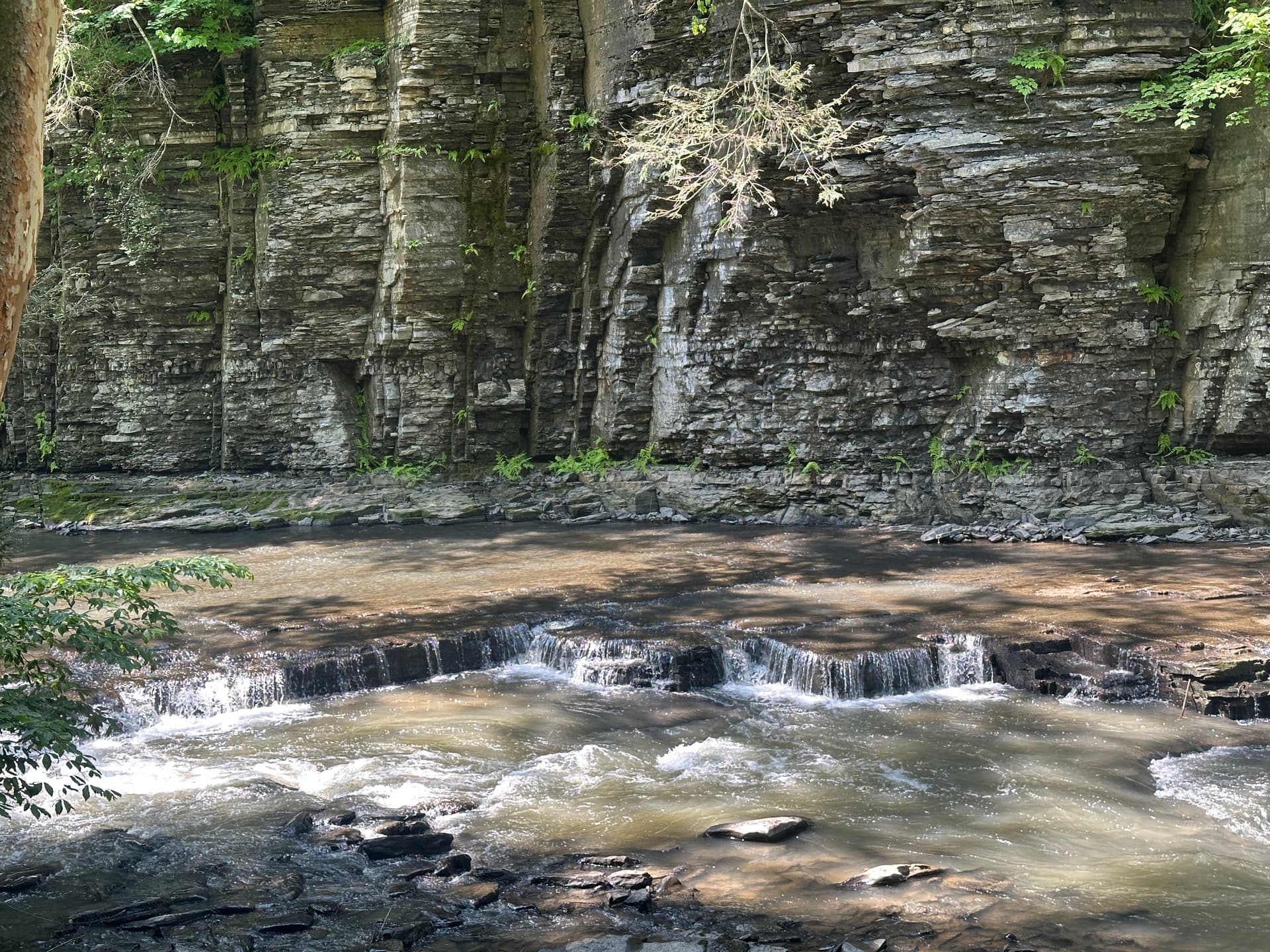 On my way from Cayuga Cliffs to Abbot Ascents, I missed a turn and sometime thereafter realized I was close to Mulholland Waterfalls. So, there I stopped. Had to squeeze my car in at the end of a row. The climbs were a bit of work, but otherwise, cooler temps still prevailed along the creek.