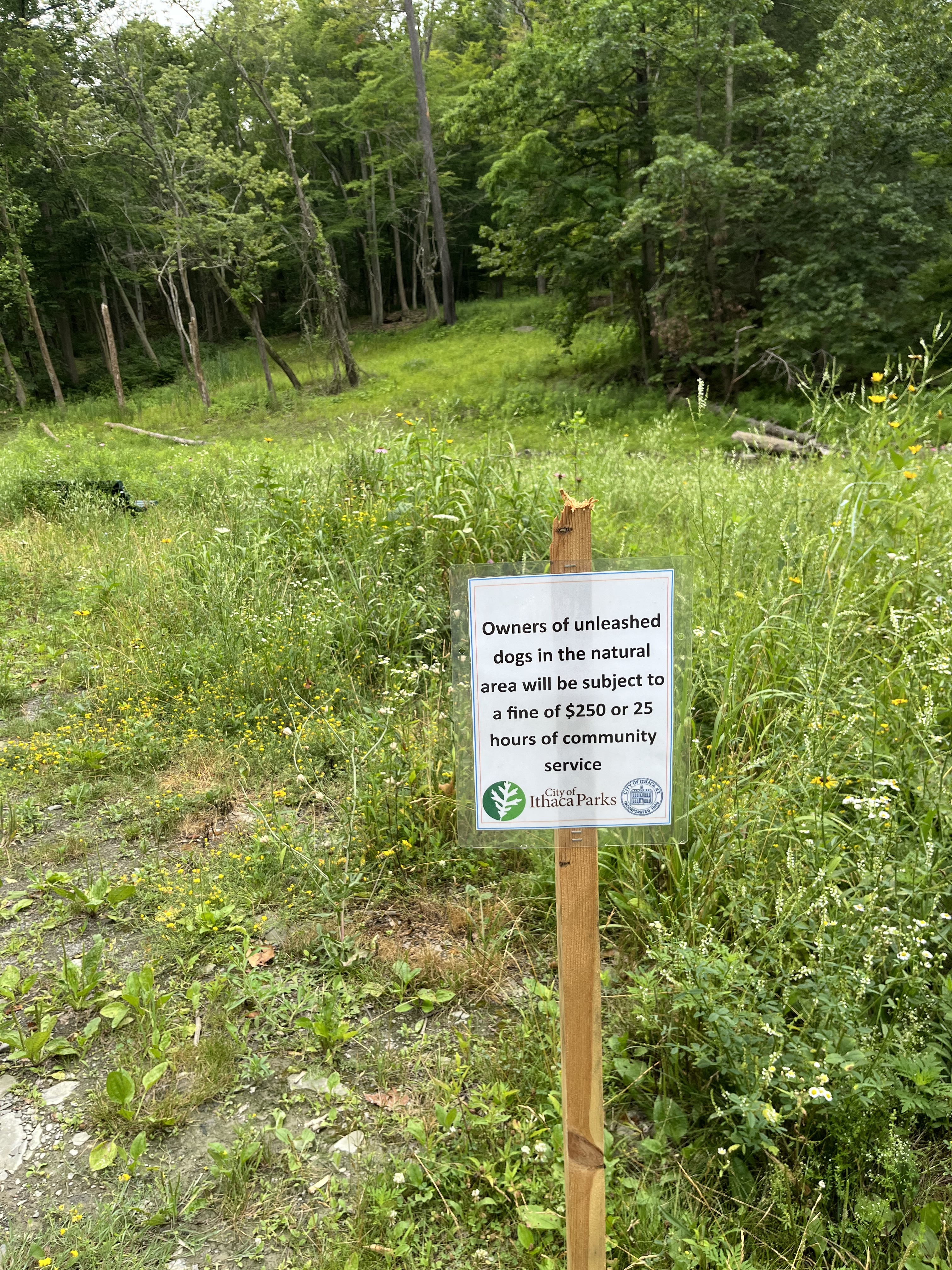 I just heard from the trail steward, who is thrilled that everyone is enjoying the park he cares for so much, but he also saw the pictures of our canine friends and wanted to reiterate that Mulholland, like all City of Ithaca parks, requires that dogs be leashed at all times. I know that can feel fussy, especially when no other people seem to be around, but he said that part of the reason is to protect the wildflowers from romping dogs—it really is a wildflower preserve. Plus, he said that some people stay away from the trails because they’re afraid of meeting off-leash dogs.