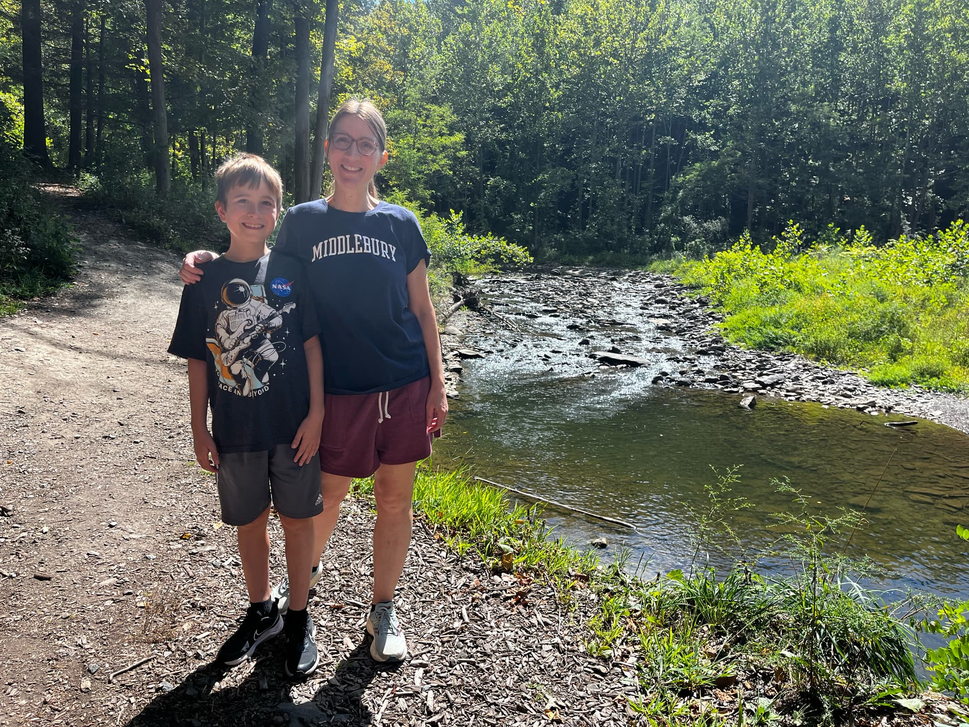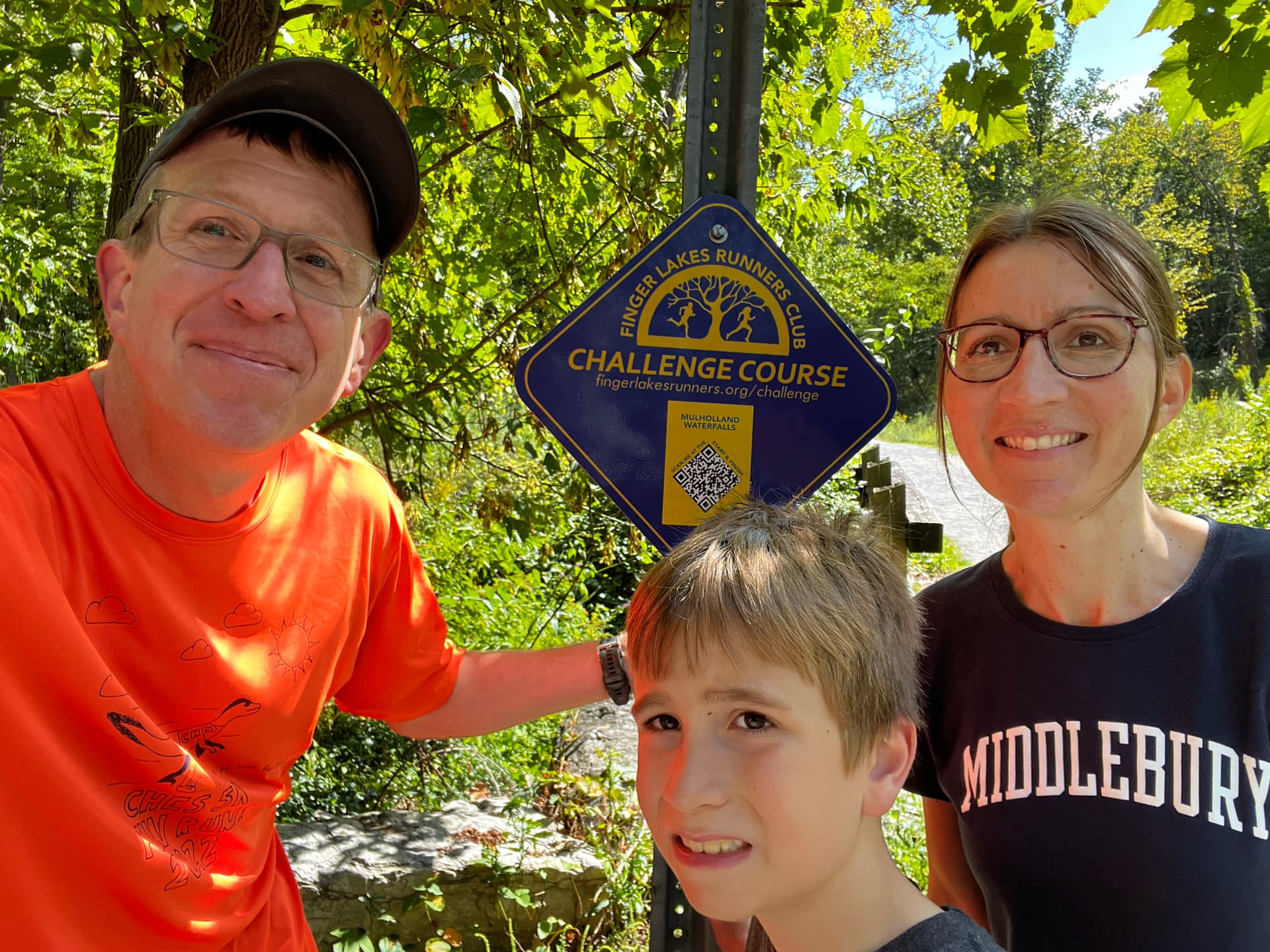 The majority of the Woodses did this course as a family stroll on a beautiful day. The parking lot was full, and the trail was full of soggy collegers. But the creek was sparkling and the breeze was gentle and it was an ideal day for a walk on the trail.