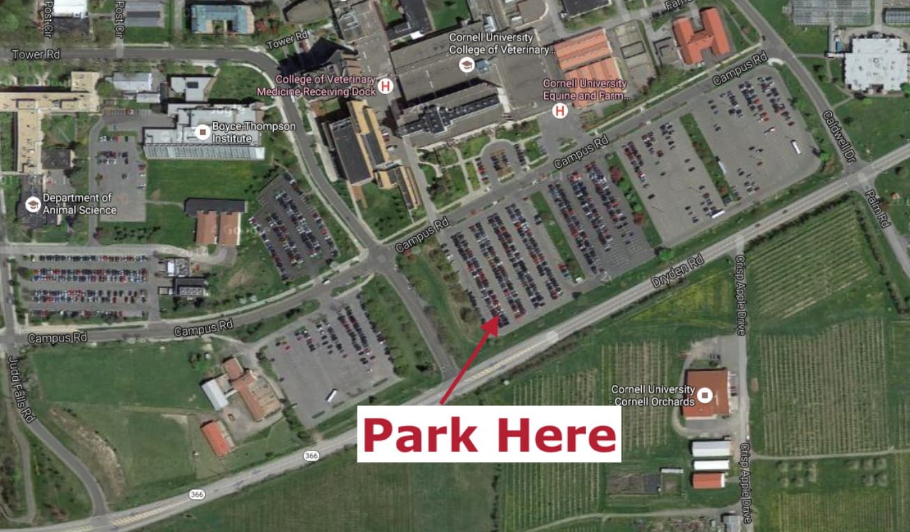 The main carpool will leave from the southwest corner of Cornell’s B-lot on Sunday morning (see image below). Plan to arrive at 6:45 AM. Jay Hubisz (@hubitron) will sort people into cars for a departure at 7:00 AM sharp.