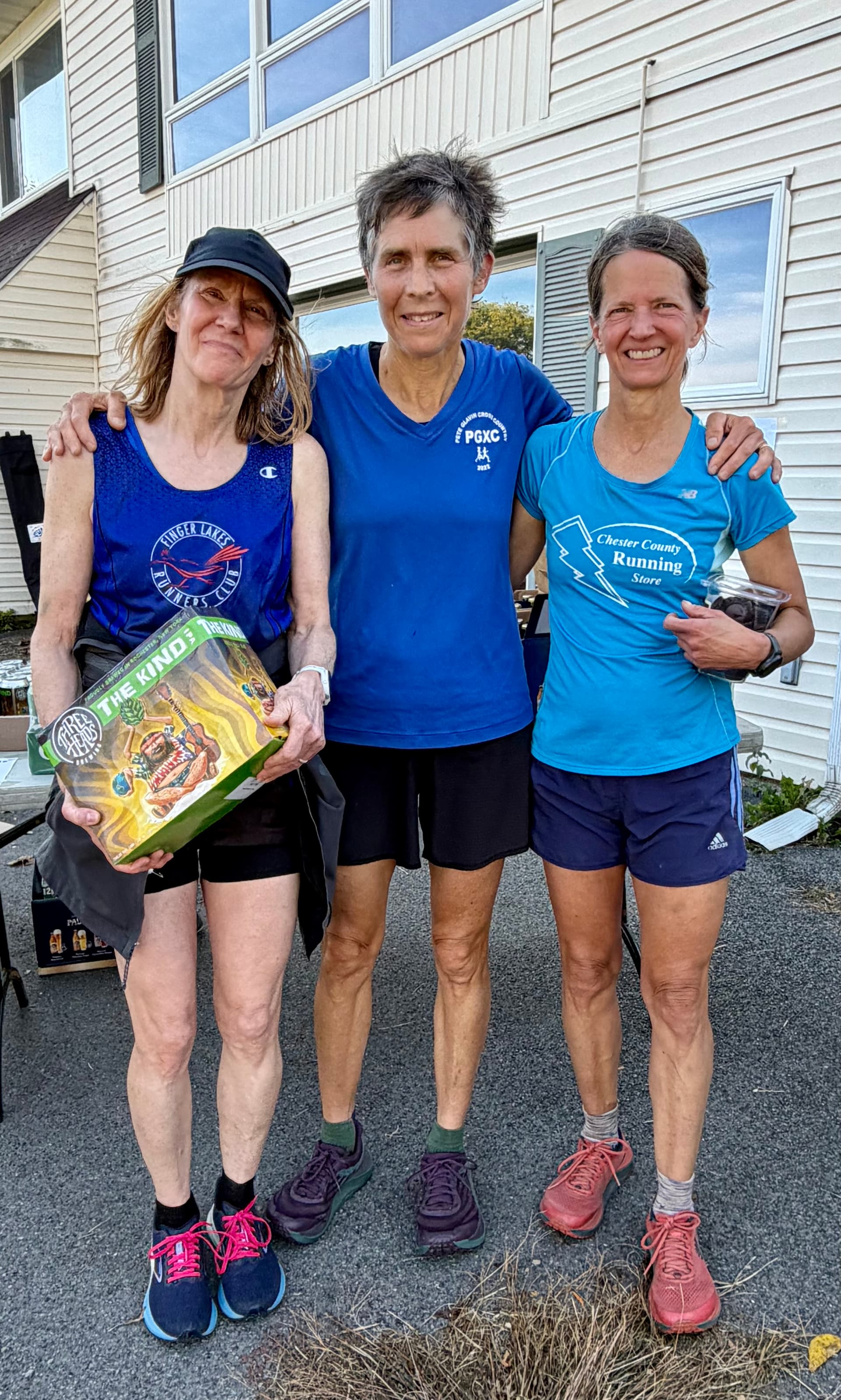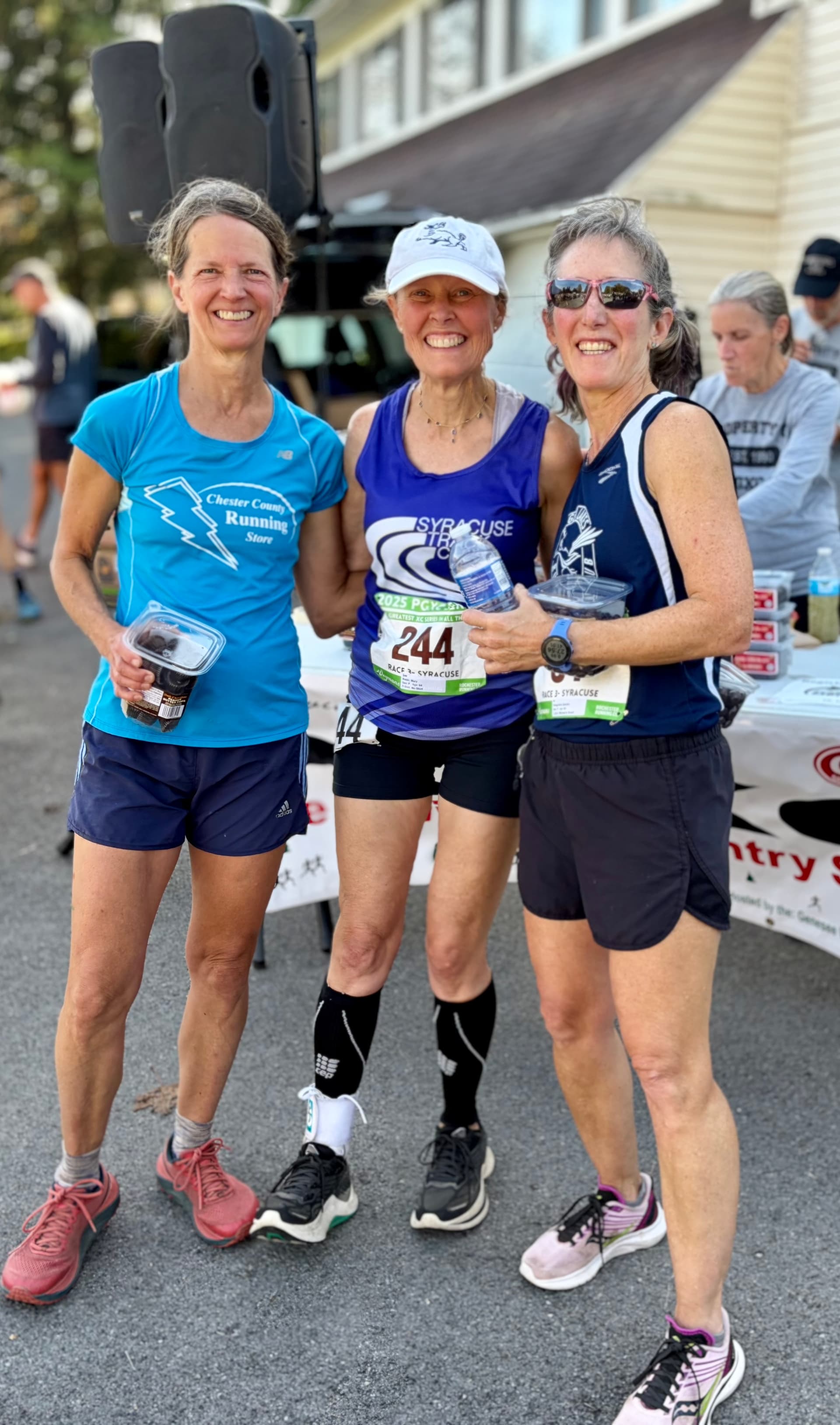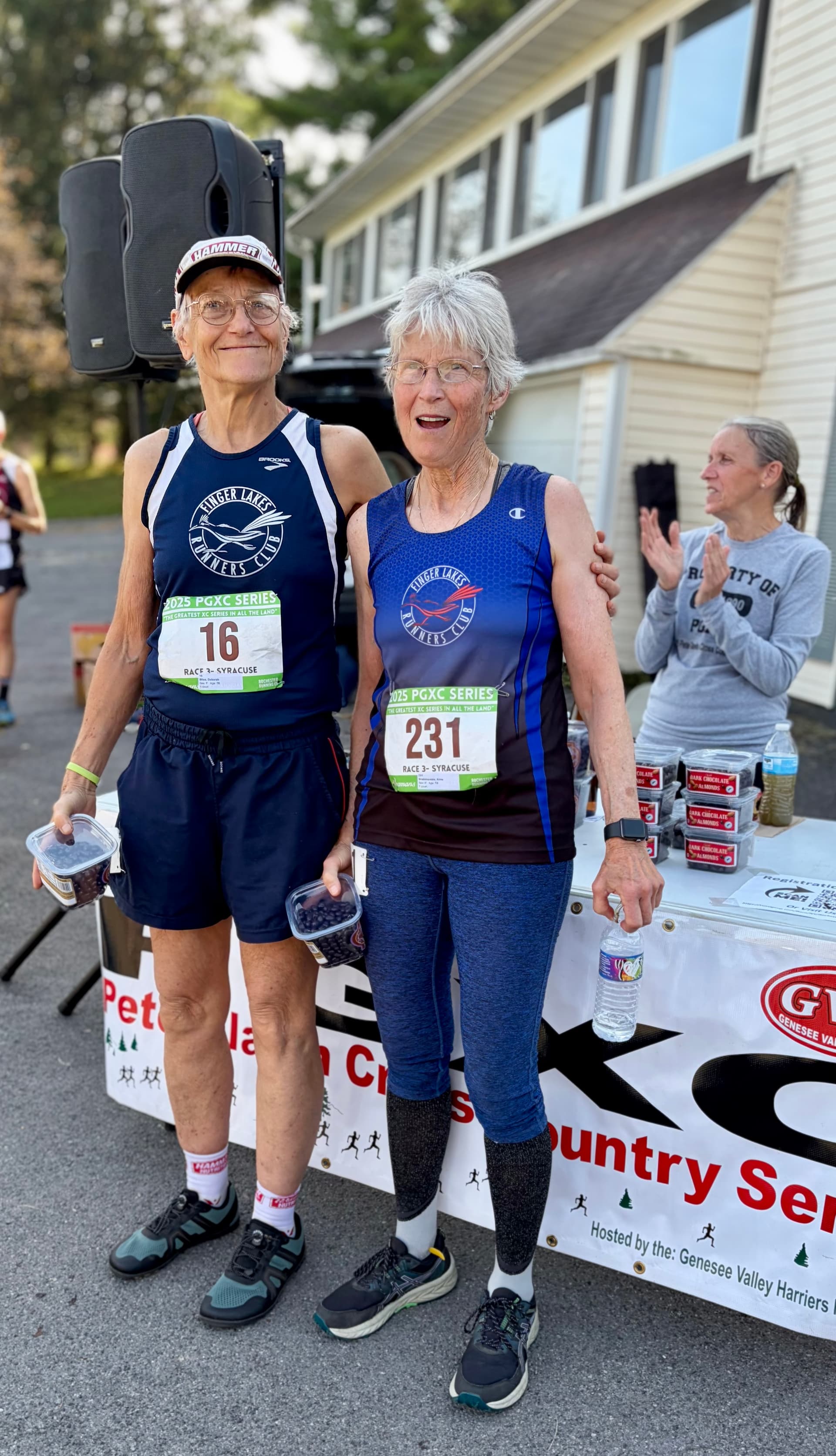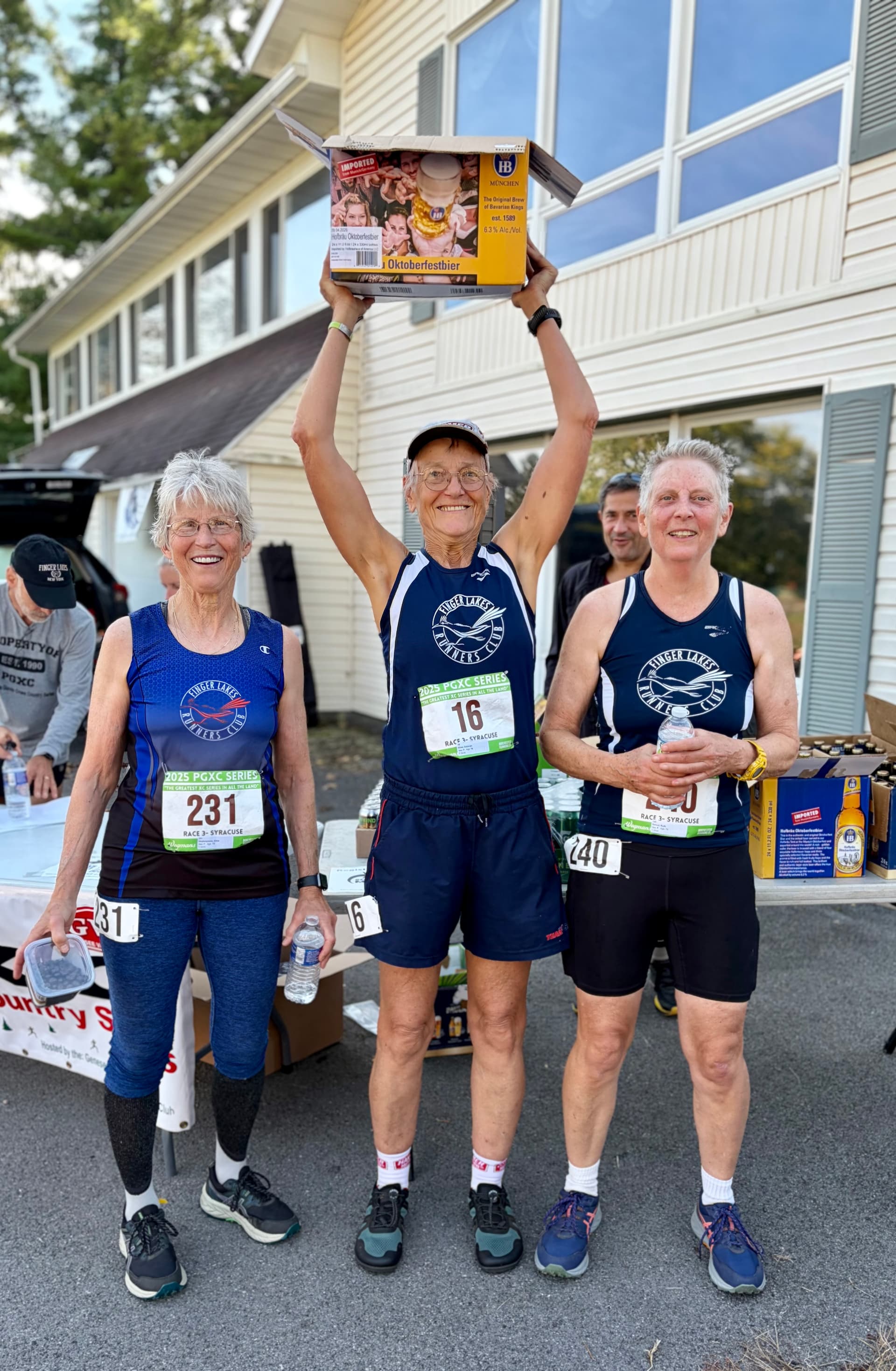 On the FLRC women’s side, we won the Vets, Super Vets, and Ultra Vets categories! We stuck with the winning formula for the Vets, with Julie Barclay (1), Kim Jackson (4), and Sandy Gregorich (5) once again combining for the win, just 3 points ahead of Syracuse Track Club and 12 ahead of GVH. The Super Vets swept, with the minimum 6 points from Lori Johnson (1), Gill Haines-Sharp (2), and Laura Helmerick (3). They beat three teams from GVH, STC, and Checkers. Finally, our Ultra Vets team of Anne Shakespeare (1), Deb Bliss (2), and Ruth Sproul (3) once again won unopposed.