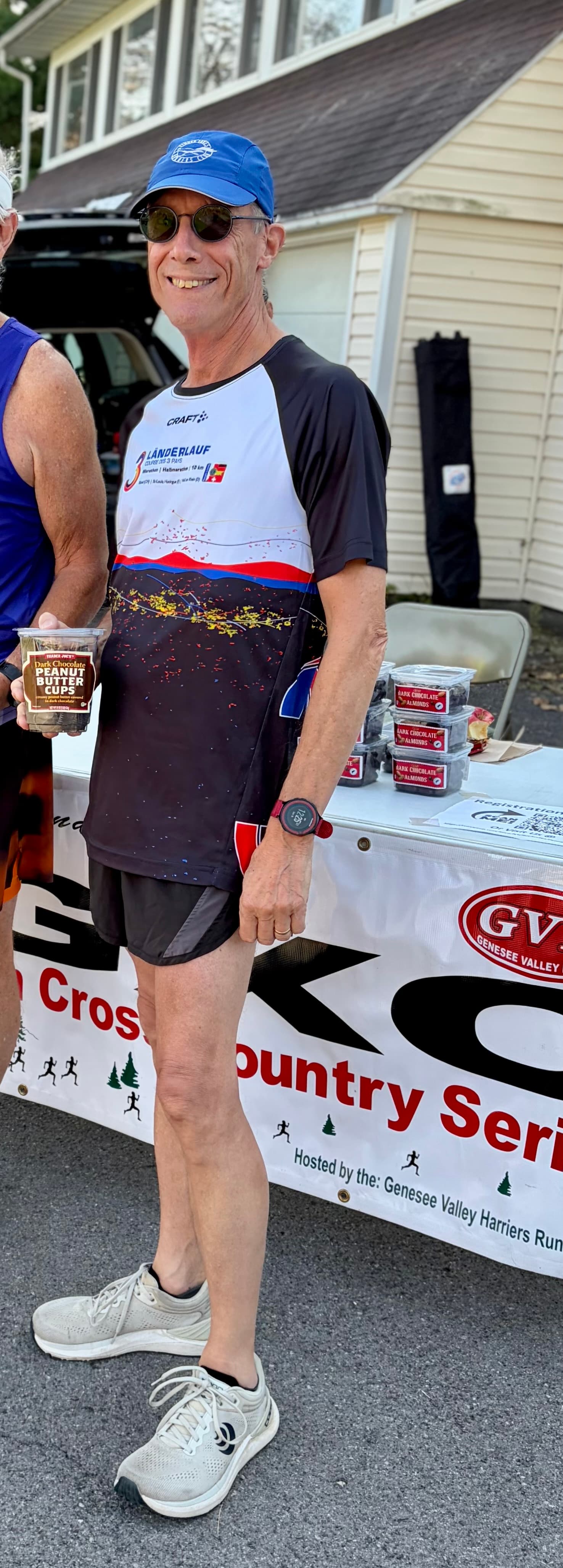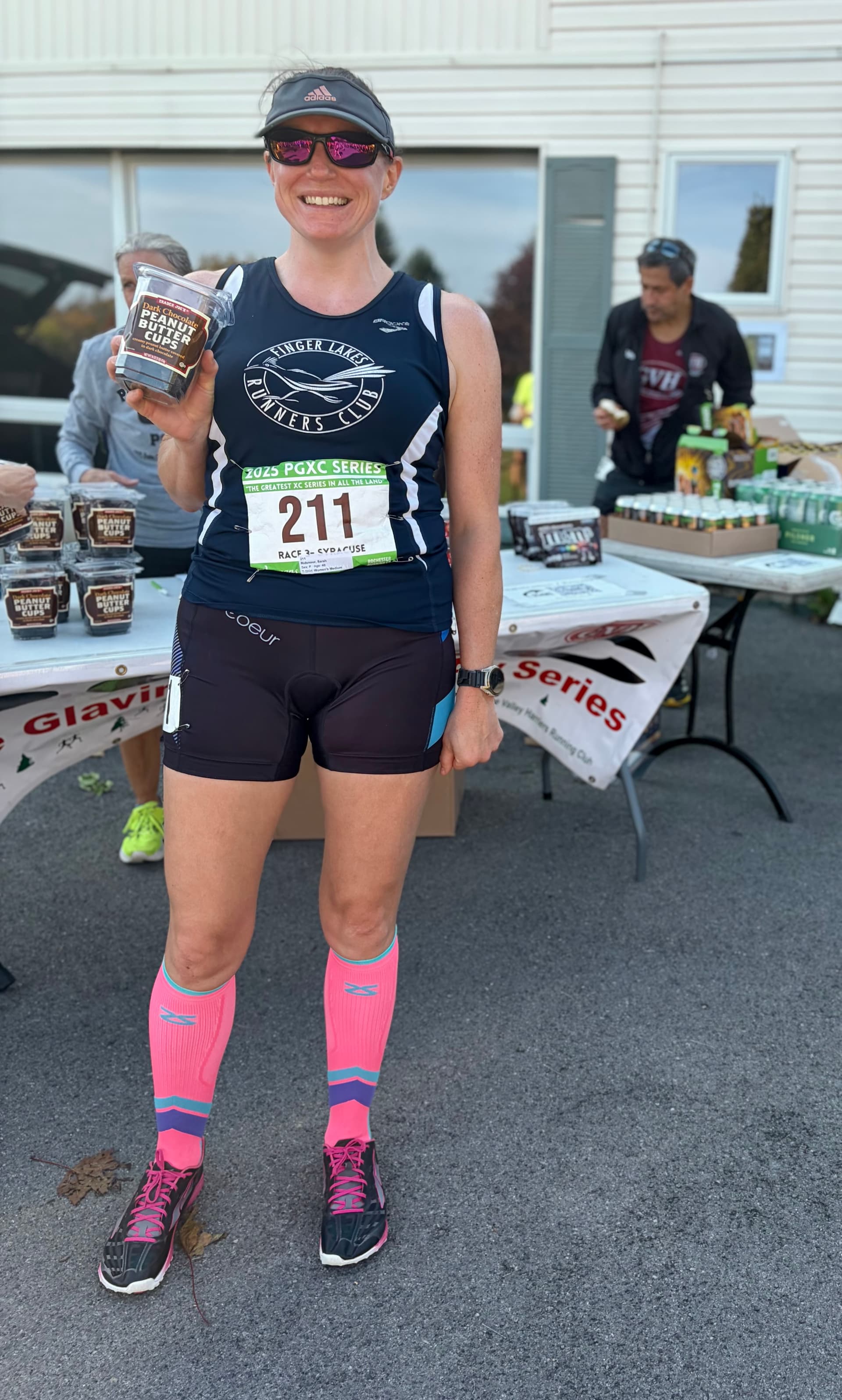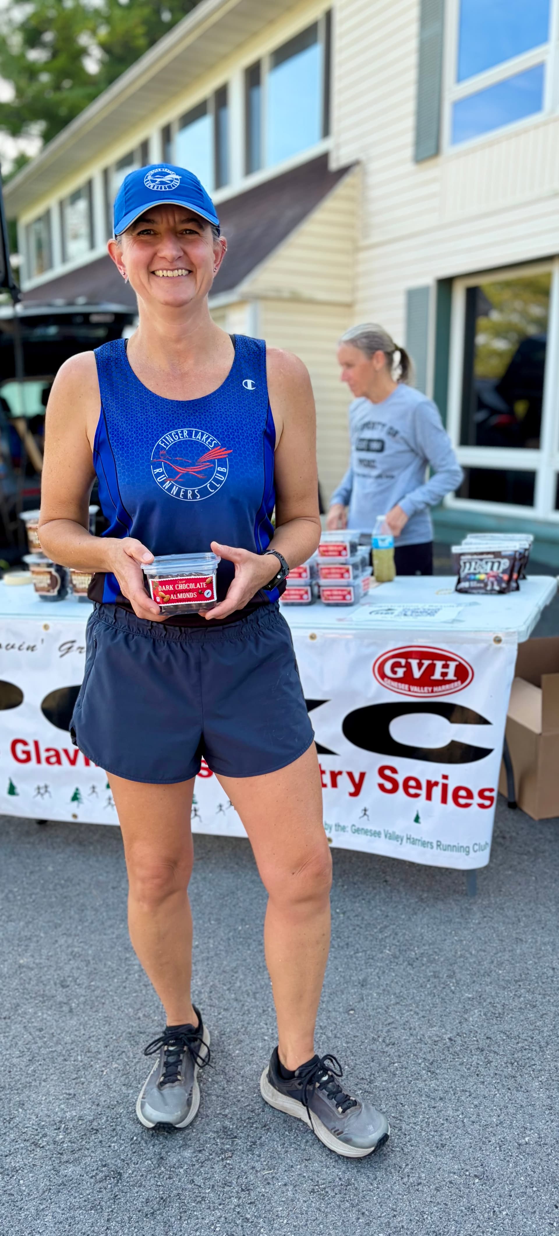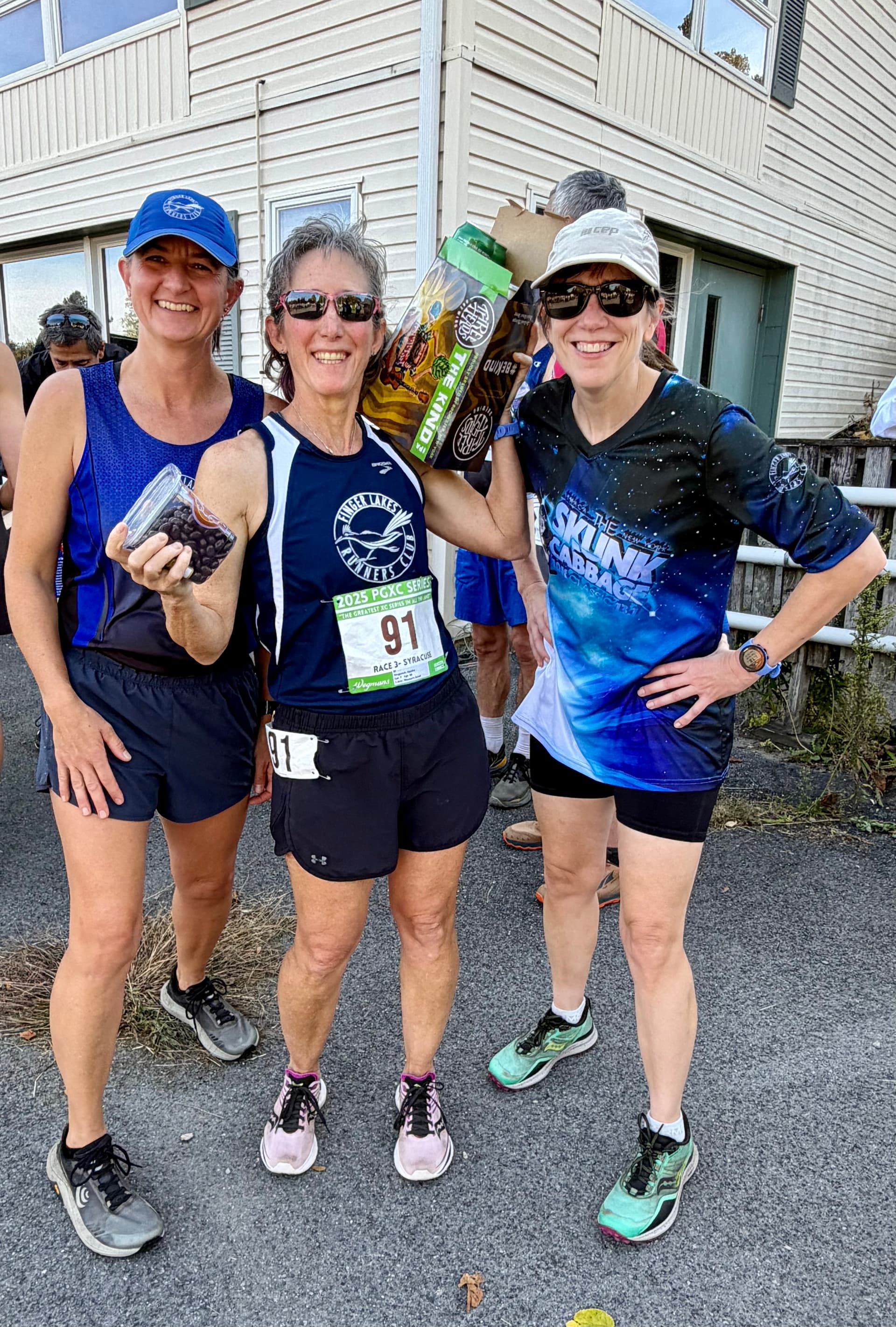 On the FLRC women’s side, we won the Vets, Super Vets, and Ultra Vets categories! We stuck with the winning formula for the Vets, with Julie Barclay (1), Kim Jackson (4), and Sandy Gregorich (5) once again combining for the win, just 3 points ahead of Syracuse Track Club and 12 ahead of GVH. The Super Vets swept, with the minimum 6 points from Lori Johnson (1), Gill Haines-Sharp (2), and Laura Helmerick (3). They beat three teams from GVH, STC, and Checkers. Finally, our Ultra Vets team of Anne Shakespeare (1), Deb Bliss (2), and Ruth Sproul (3) once again won unopposed.
