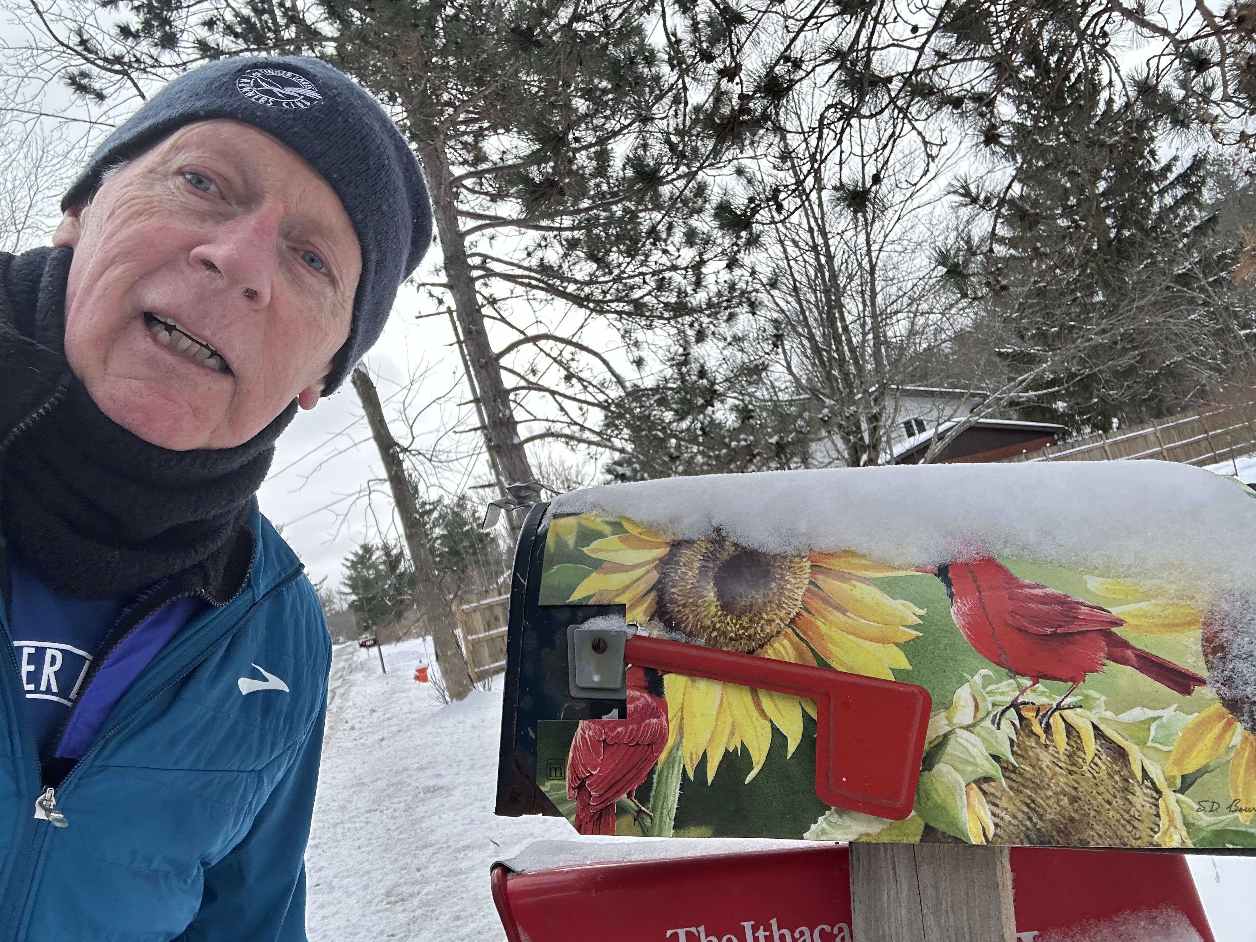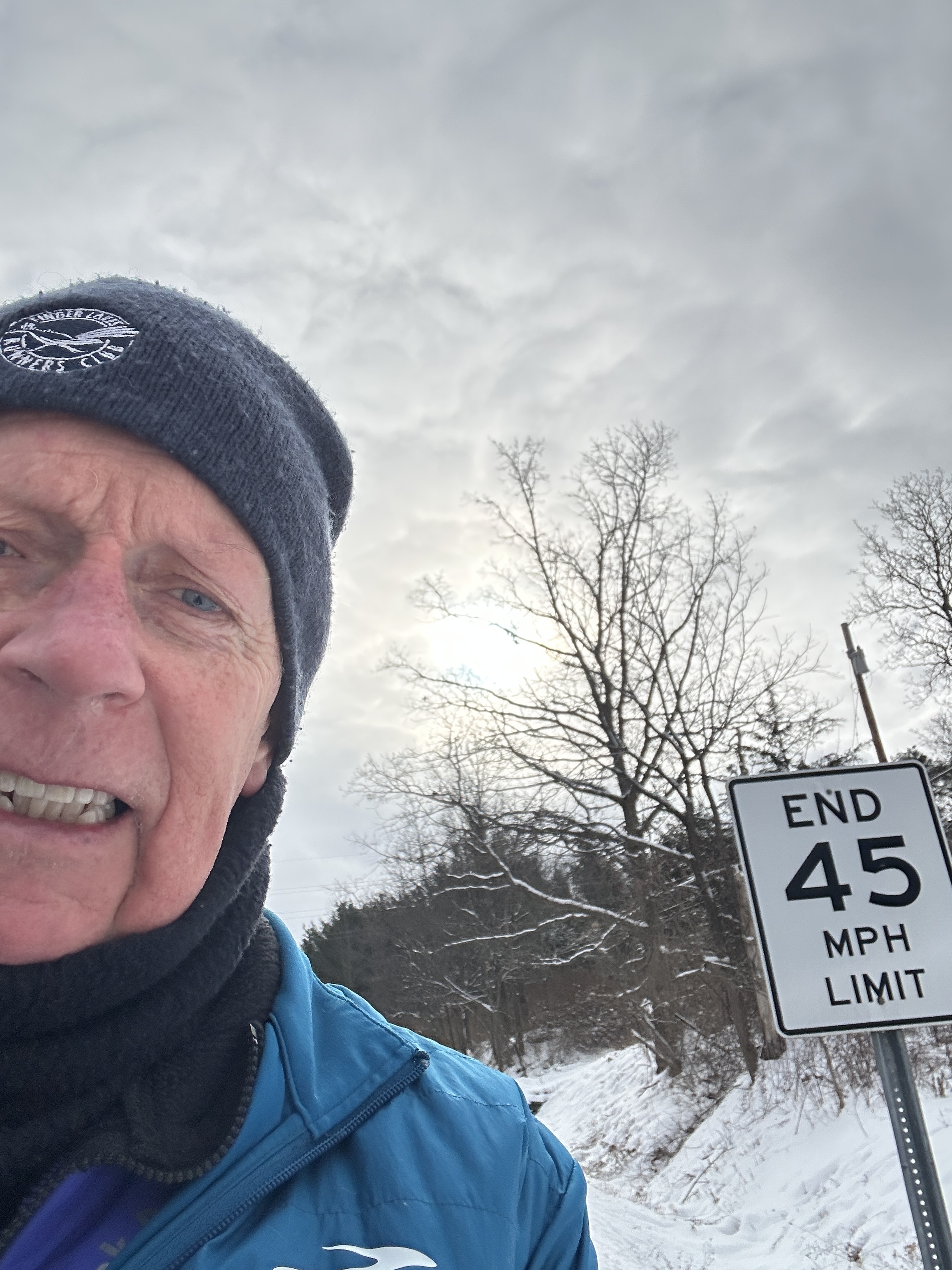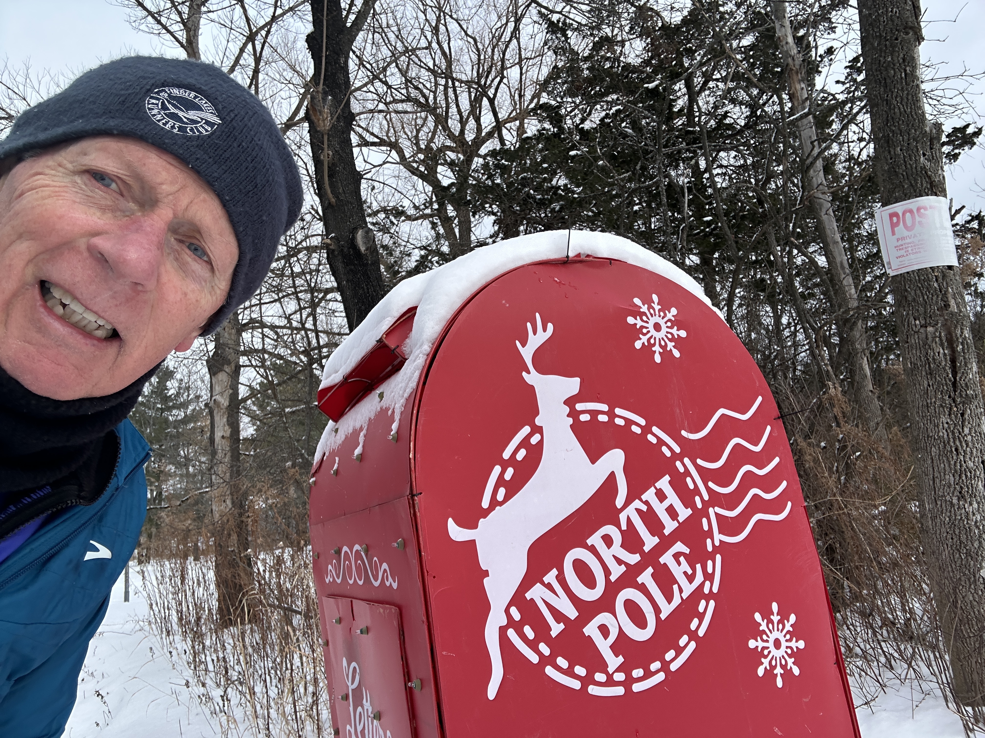 Off on my Scavenger Hunt Quest. Got my FLRC hat and shirt (you can’t see the socks), my old dog running partner-Ubu, and we’re off. Finally came upon this Speed Limit Sign-End of 45 MPH-phew- I can pick up the pace. Here’s a decorated Lamp Post. Then we spotted a decorated mail box, but then found this big one to put my Santa letter in. Next an outdoor decorated tree-daylight viewing isn’t too great. On we go. Most runs are now long ones, even if we don’t go very far. By the time we got home there was a nice Sunset. We also spotted wolf tracks, but it might have been Ubu’s.