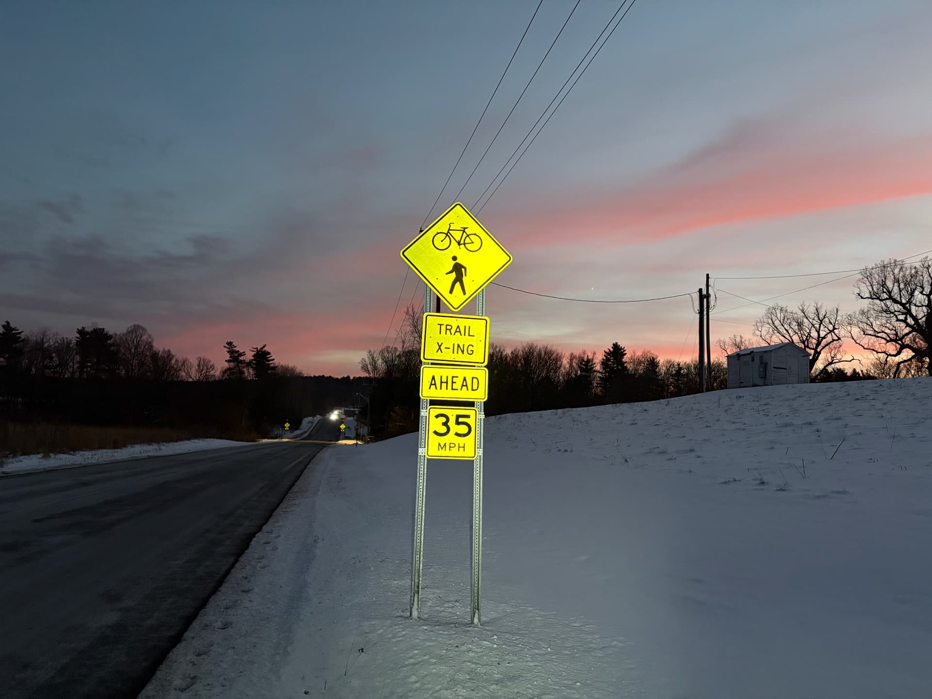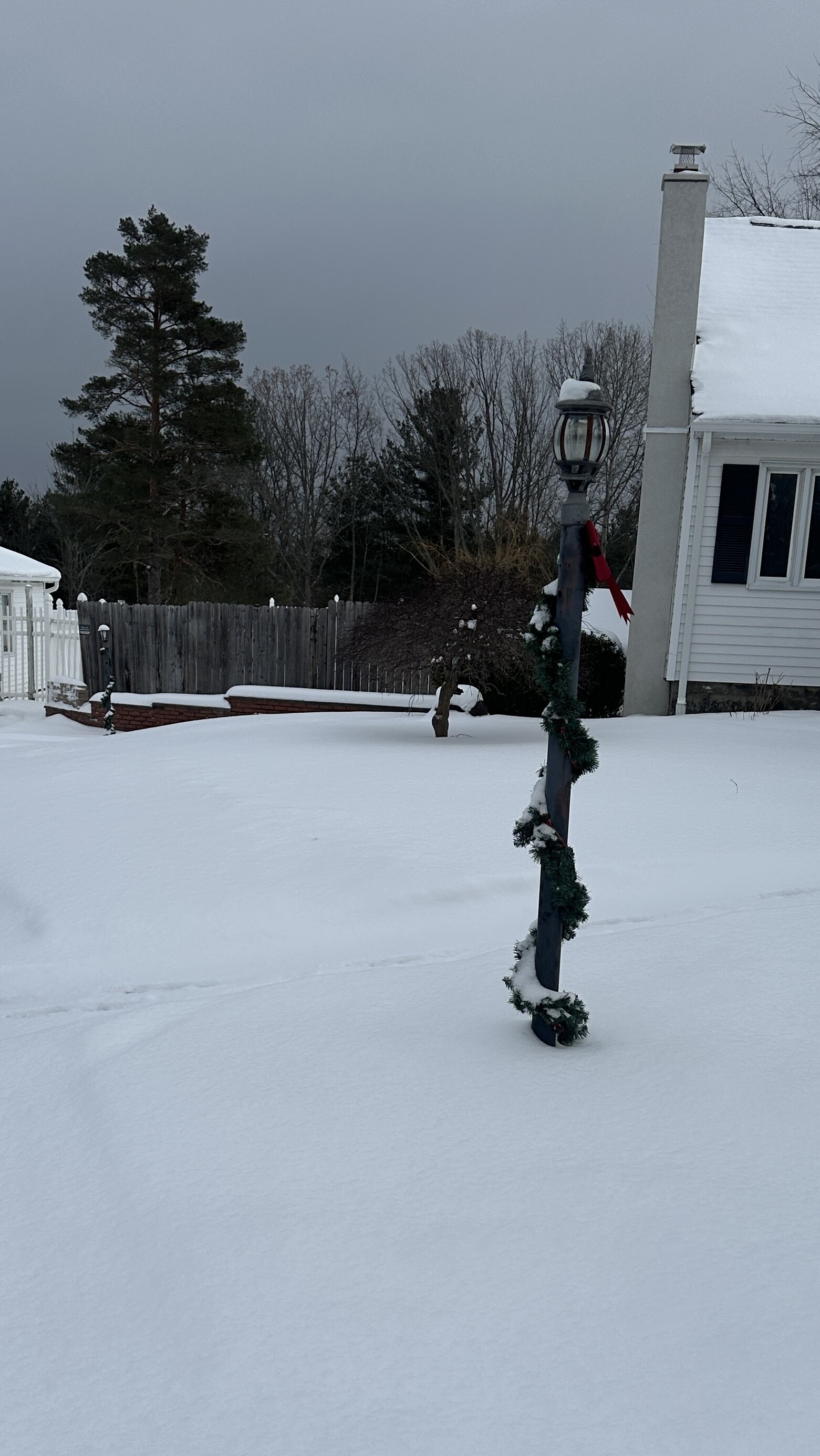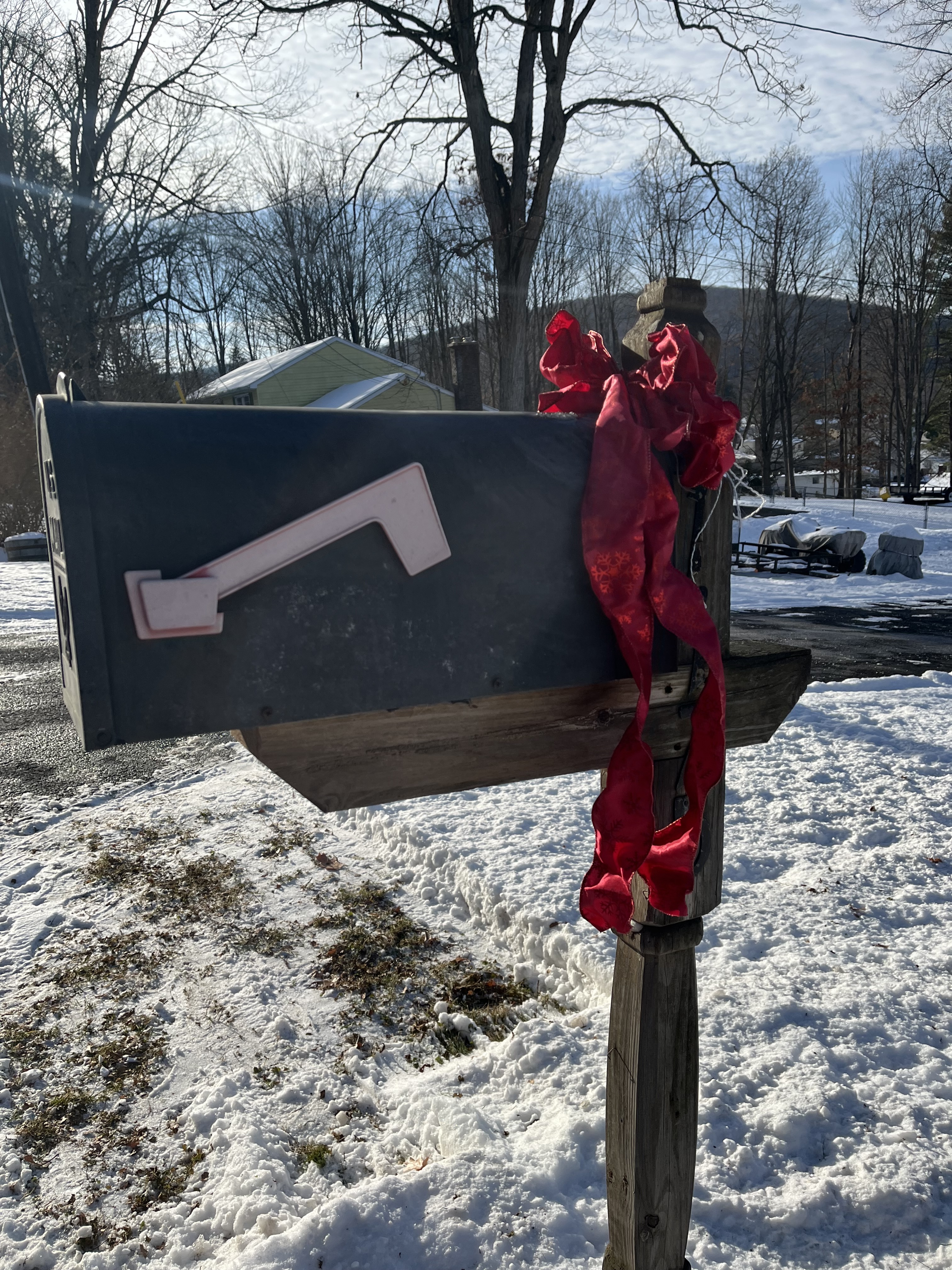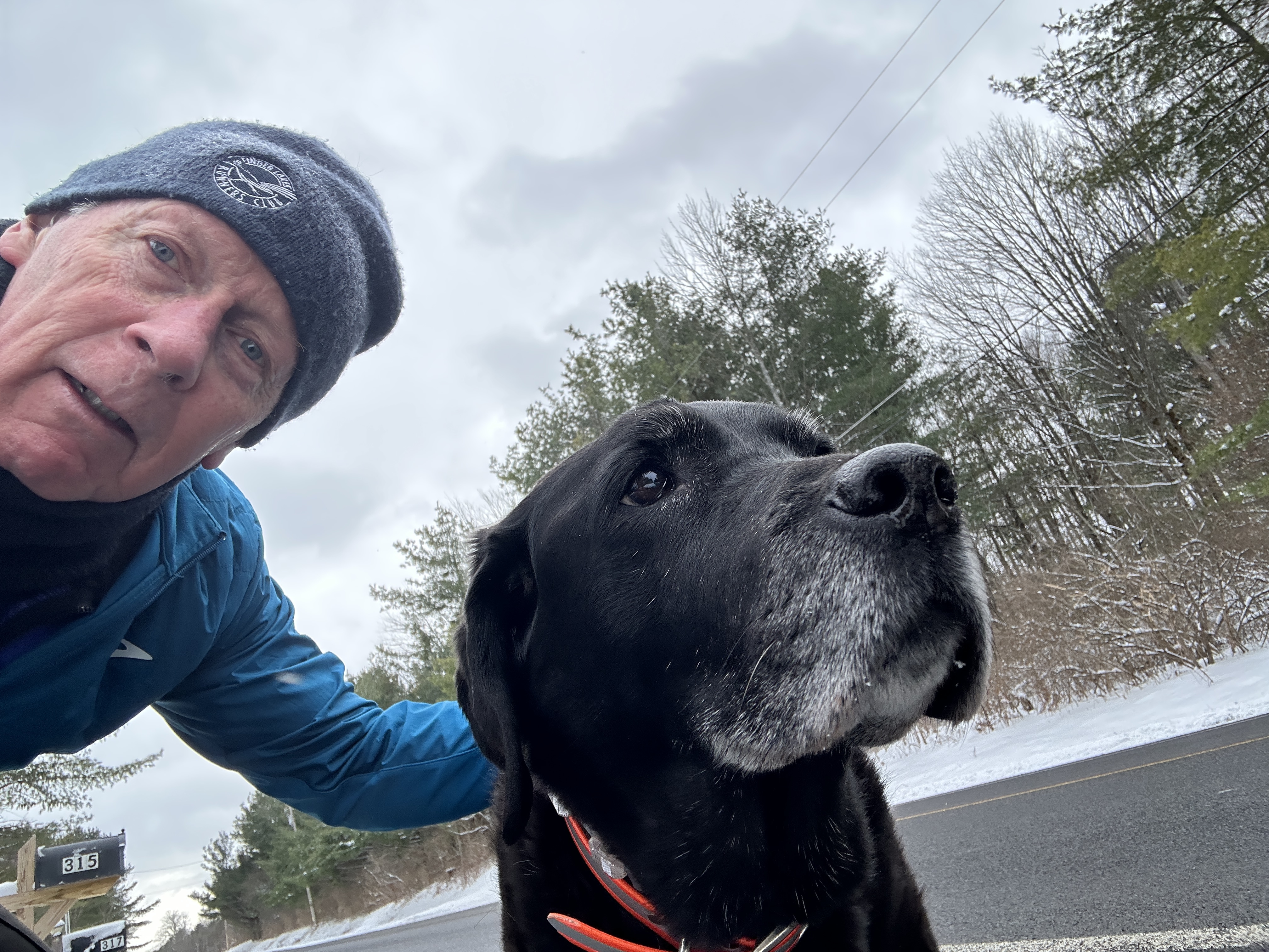 Off on my Scavenger Hunt Quest. Got my FLRC hat and shirt (you can’t see the socks), my old dog running partner-Ubu, and we’re off. Finally came upon this Speed Limit Sign-End of 45 MPH-phew- I can pick up the pace. Here’s a decorated Lamp Post. Then we spotted a decorated mail box, but then found this big one to put my Santa letter in. Next an outdoor decorated tree-daylight viewing isn’t too great. On we go. Most runs are now long ones, even if we don’t go very far. By the time we got home there was a nice Sunset. We also spotted wolf tracks, but it might have been Ubu’s.