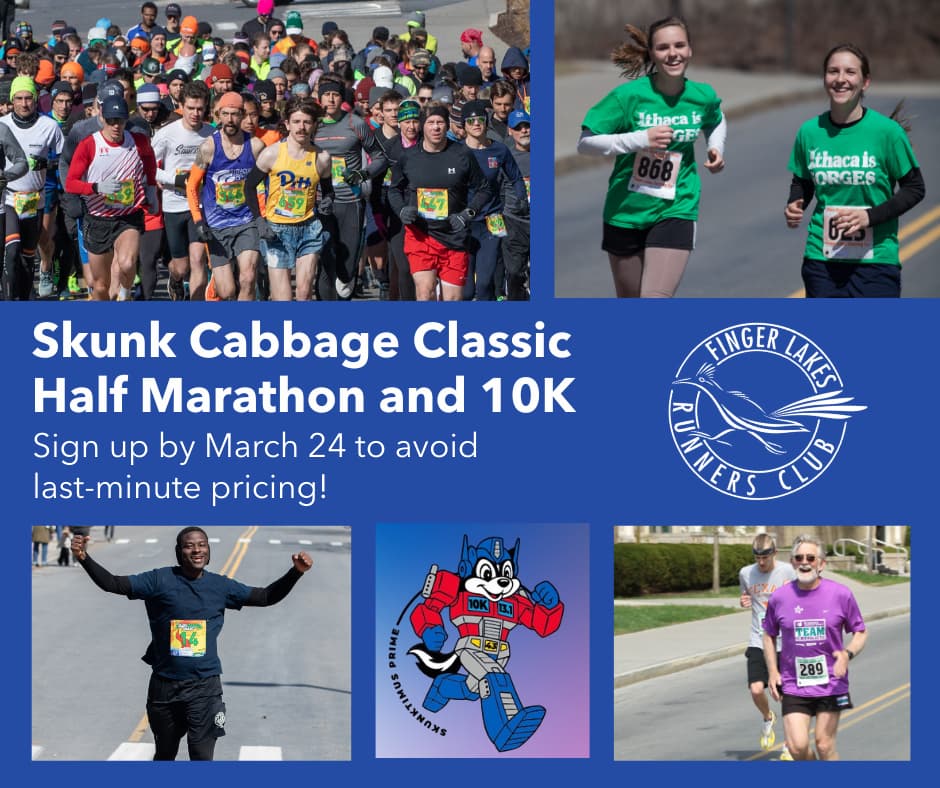 We’re finalizing our food order for the Skunk Cabbage Classic 10K and Half Marathon soon, and a more accurate runner number will be a big help in buying the right amount. That’s why race registration fees rise after March 24, so register now to save and get ready for a great morning on March 29 as you join a crowd of runners surging through the Cornell campus, zipping along the creekside East Hill Recway, and cruising along the country roads beyond. The shirts and medals arrived yesterday, and they look great!