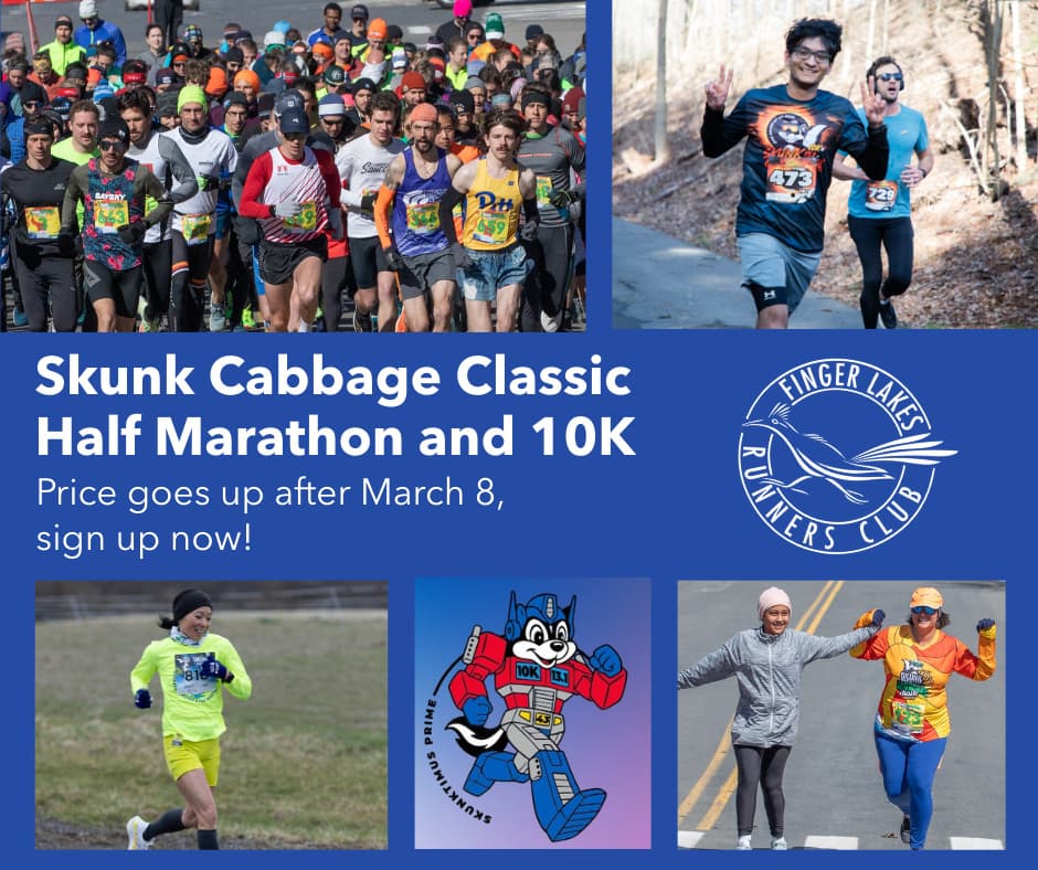 To help you train for race day, we have a few more weeks of Sunday Skunkday group runs, which begin at Cornell’s Barton Hall at 9:00 AM on Sundays. The group typically has several dozen runners who break out into small pods at different paces and distances. You can preview the exact race course or try a variation—the Skunk Cabbage area has many excellent routes. See the Group Runs category on the FLRC Forum for details; the Sunday, March 8 run is posted.