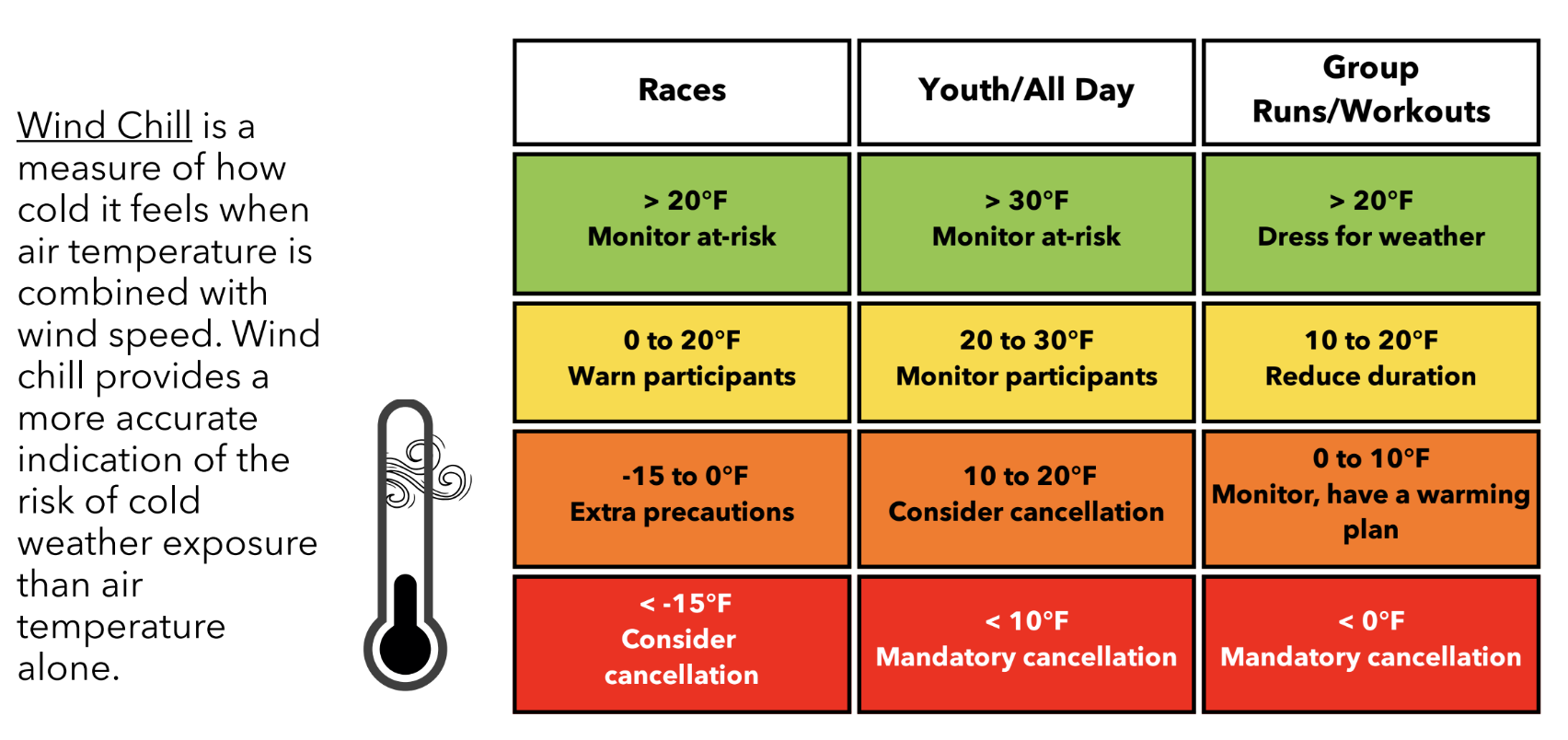 Last year, FLRC adopted an Event Cancellation Policy to help race directors, group run leaders, and others make informed decisions about how to deal with weather extremes. It’s (intentionally) a little dense, so FLRC’s Communications Team developed a handy Event Cancellation Guidelines infographic that makes it easy to determine when to make changes or consider cancellation.