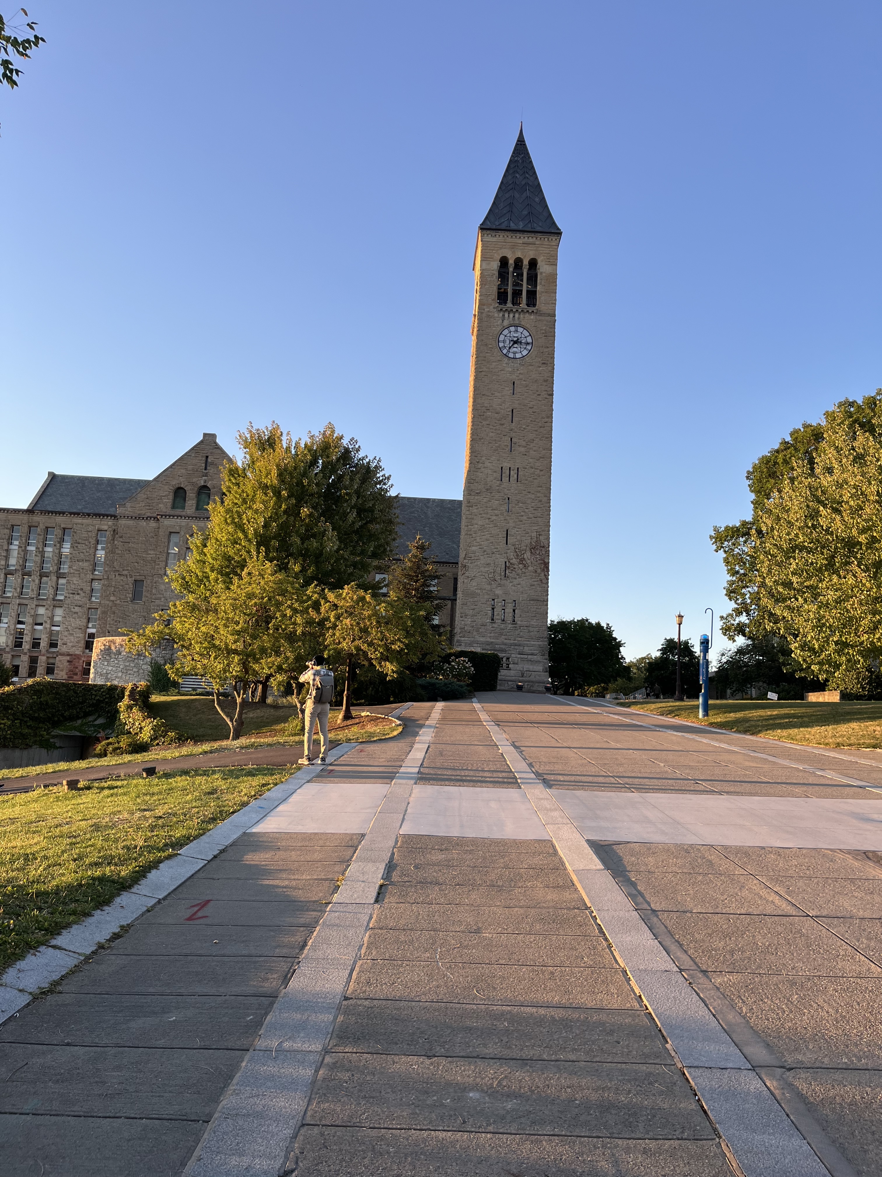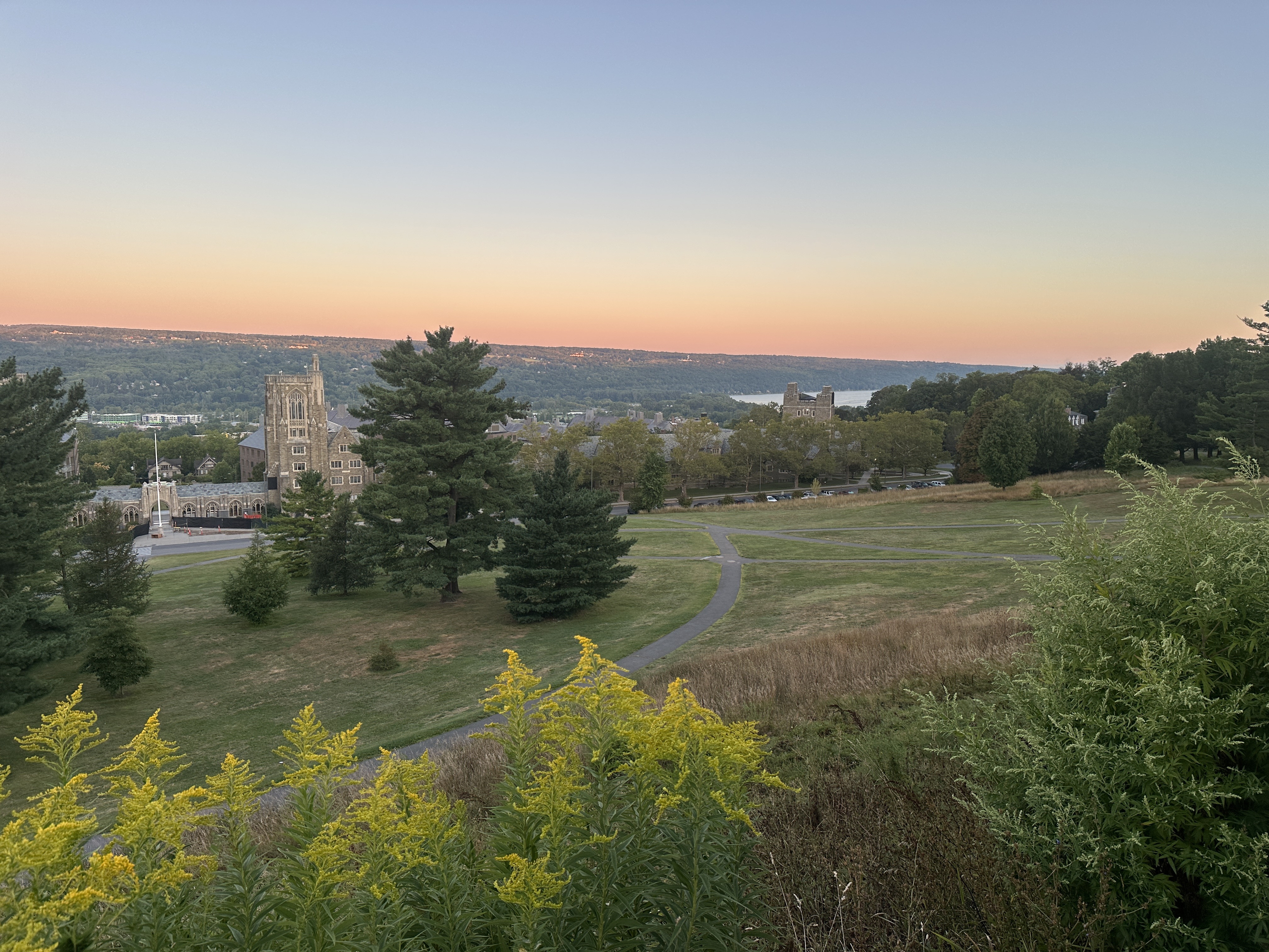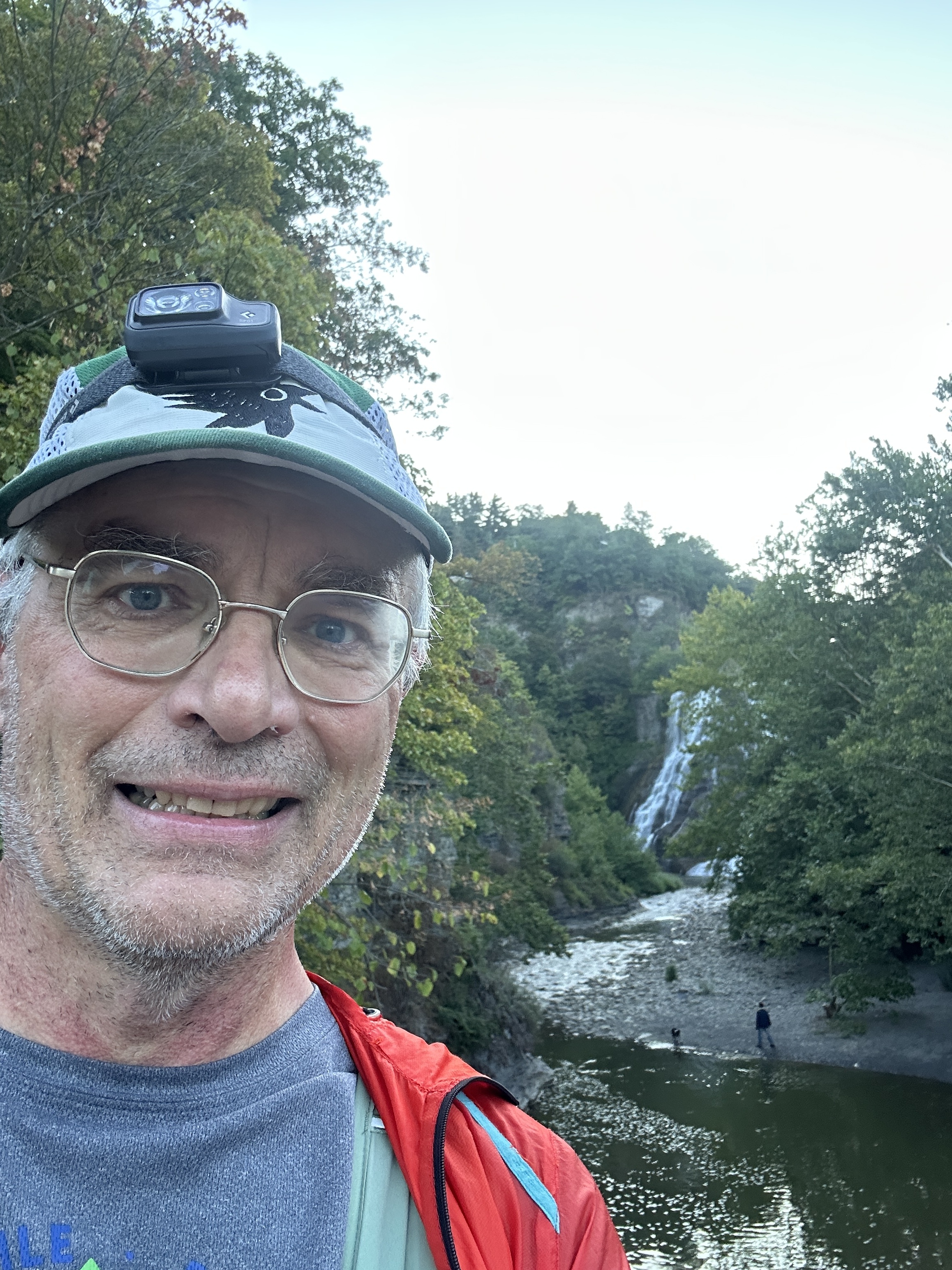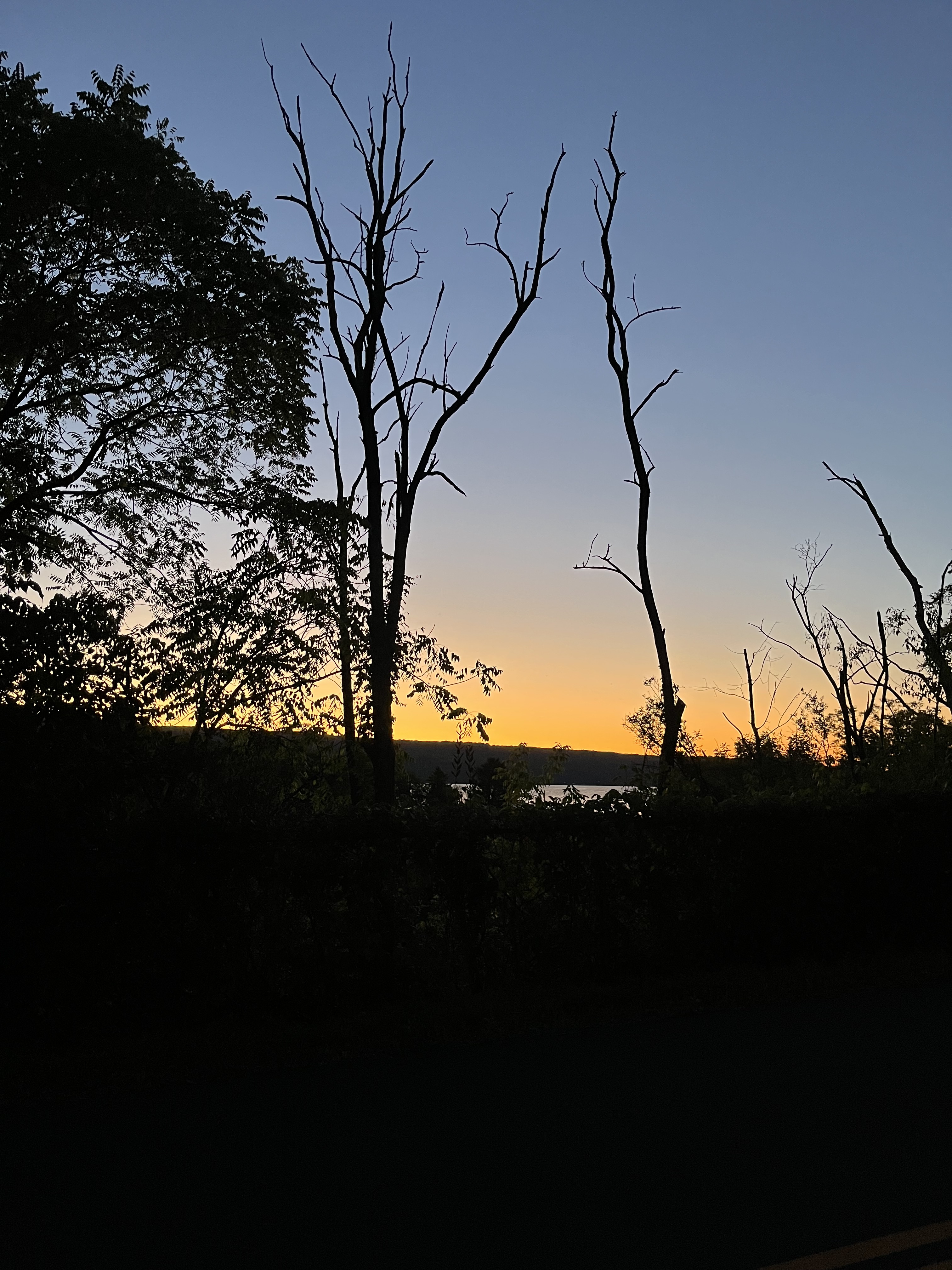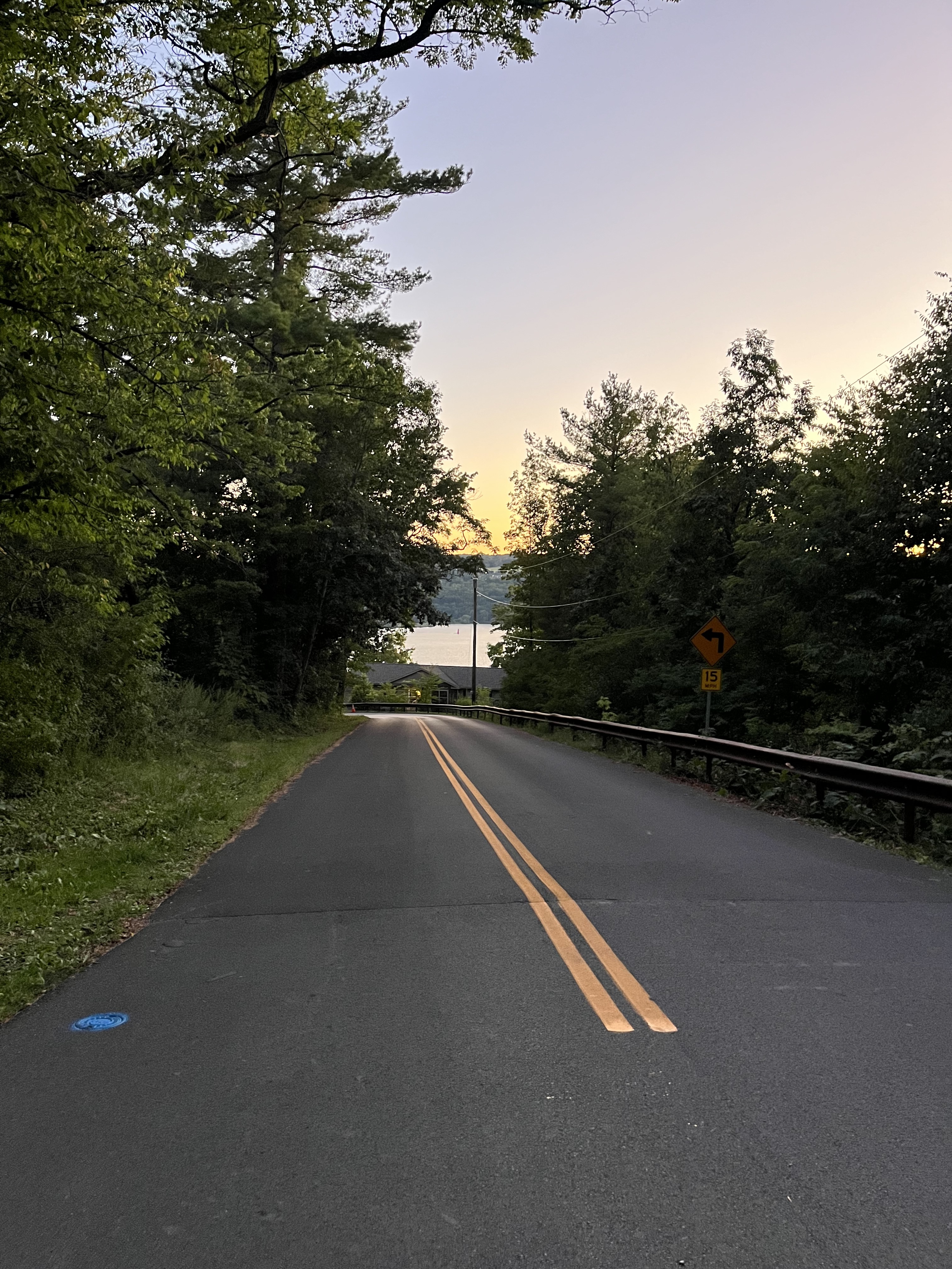 After running a 1600 and a Fall Creek Trails course earlier today in an attempt to improve my age grade score, I decided to walk this one. What a beautiful evening! Loads of folks on Libe Slope waiting to watch the sunset. It felt quite festive. And then a more solitary walk as dusk fell and the night sounds chorus began. Spotted an osprey on a branch above me on Remington. Judging by the bird poop on the road it is a regular hangout spot. And such a beautiful orange sky as I neared the bottom.