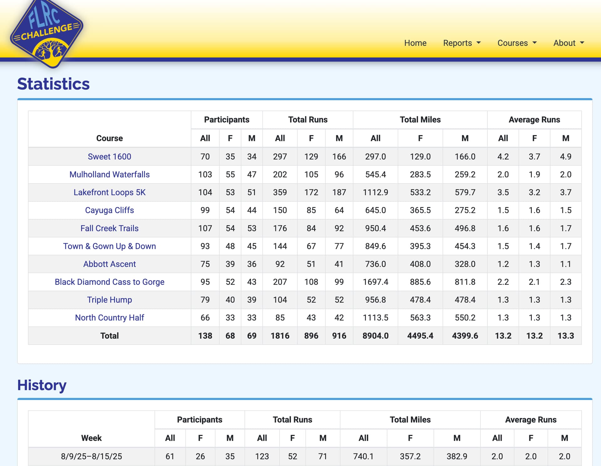 I also want to call out two special completions. First, Gill Haines-Sharp has now completed all ten FLRC Challenge courses an impressive FIVE times. That has helped her stay in the lead for Most Miles through much of the summer, aided in part by our second special completion. Pete Kresock just announced that he met his Personal Challenge for the year by completing all 50 of the FLRC Challenge courses from the last five years. He didn’t get mileage from previous years’ courses, which has kept him in second for a while now.